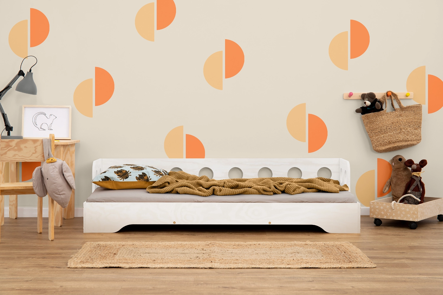 Das TILA 5S ist ein Bett im Sofa-Stil, ideal zum Schlafen, Ausruhen und Spielen. Die offene, niedrige Konstruktion sorgt für einen leichten Auf- und Abstieg und unterstützt die Entwicklung der Selbstständigkeit Ihres Kindes, während ein Geländer mit runden Aussparungen an der Langseite des Bettes für bequemen Halt sorgt. Das Bett aus hochwertigem Kiefernsperrholz ist in 11 Farben und 20 Größen erhältlich und passt perfekt in jede Einrichtung. Die glatten, abgerundeten Kanten gewährleisten eine sichere Nutzung, die vom renommierten deutschen Prüfengel-Institut zertifiziert wurde. Der inklusive Lattenrost mit der max. Belastbarkeit bis zu 300 kg macht das Bett sofort nach dem Zusammenbau einsatzbereit.