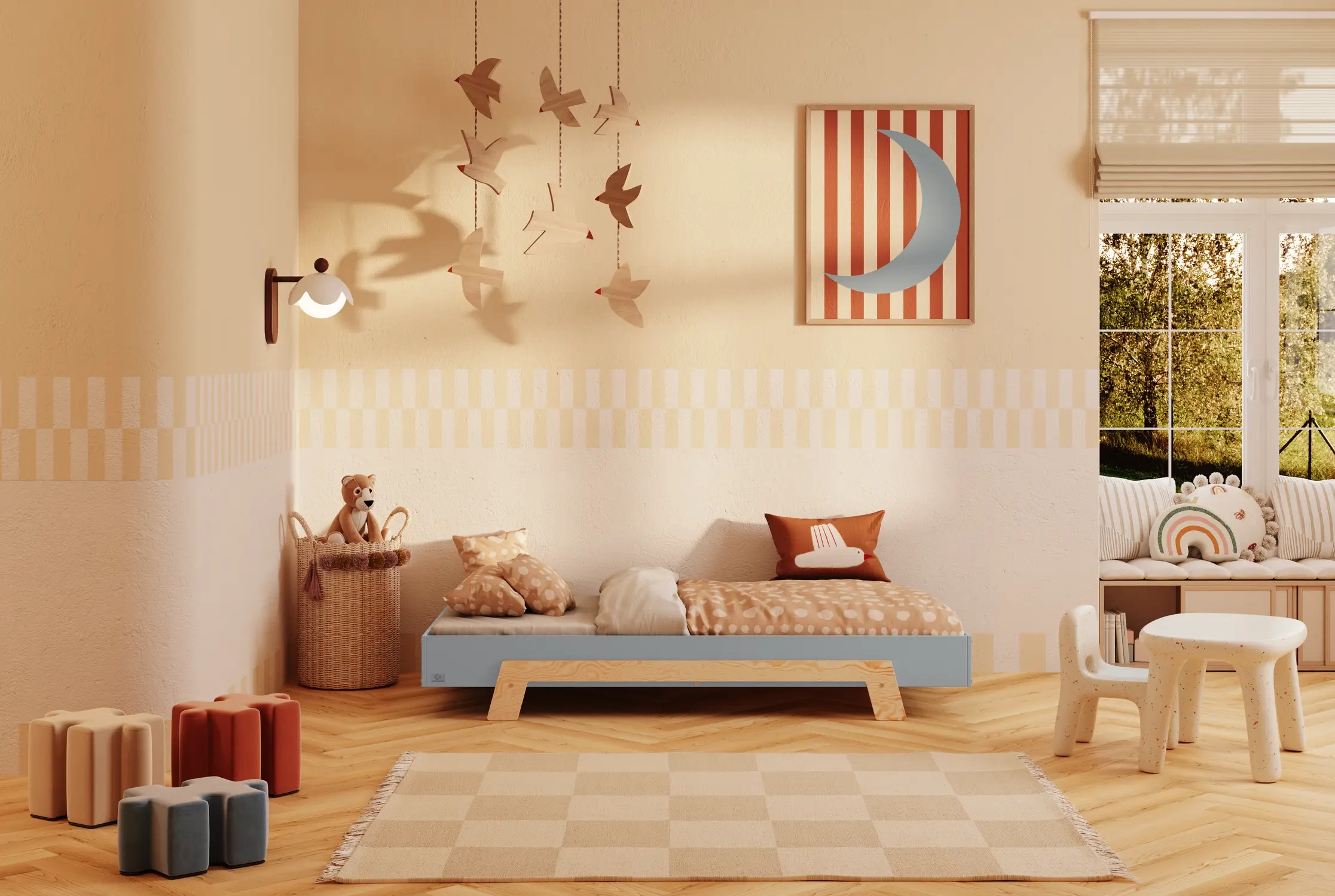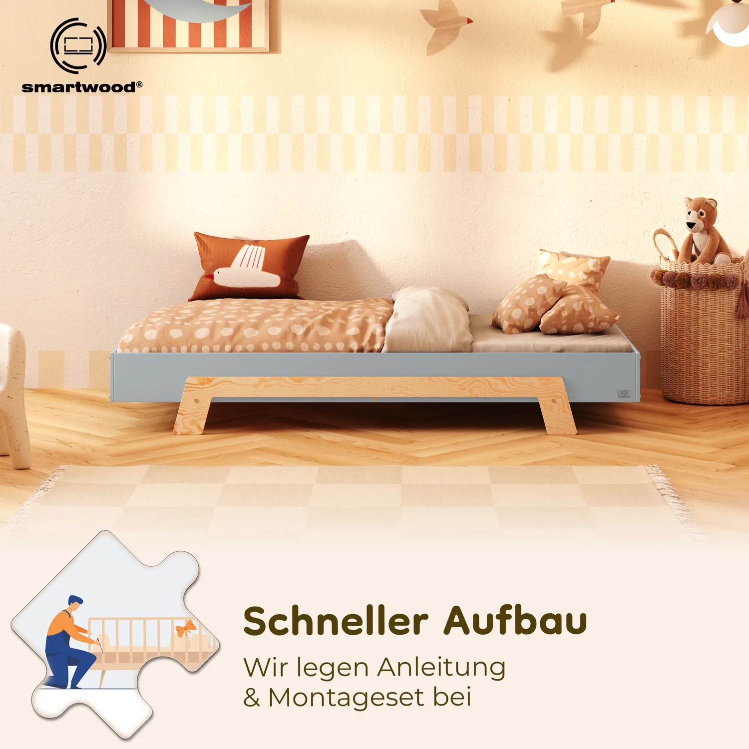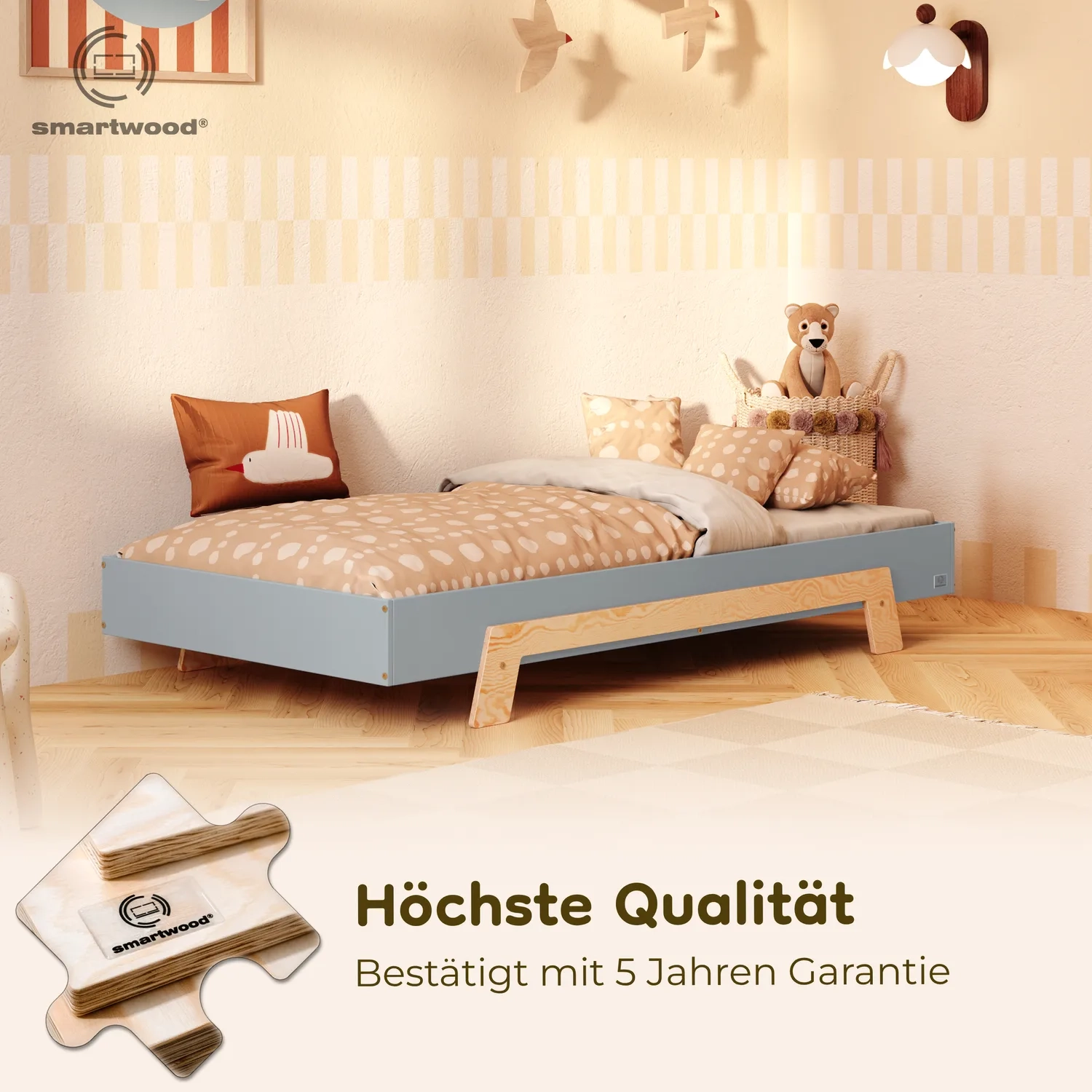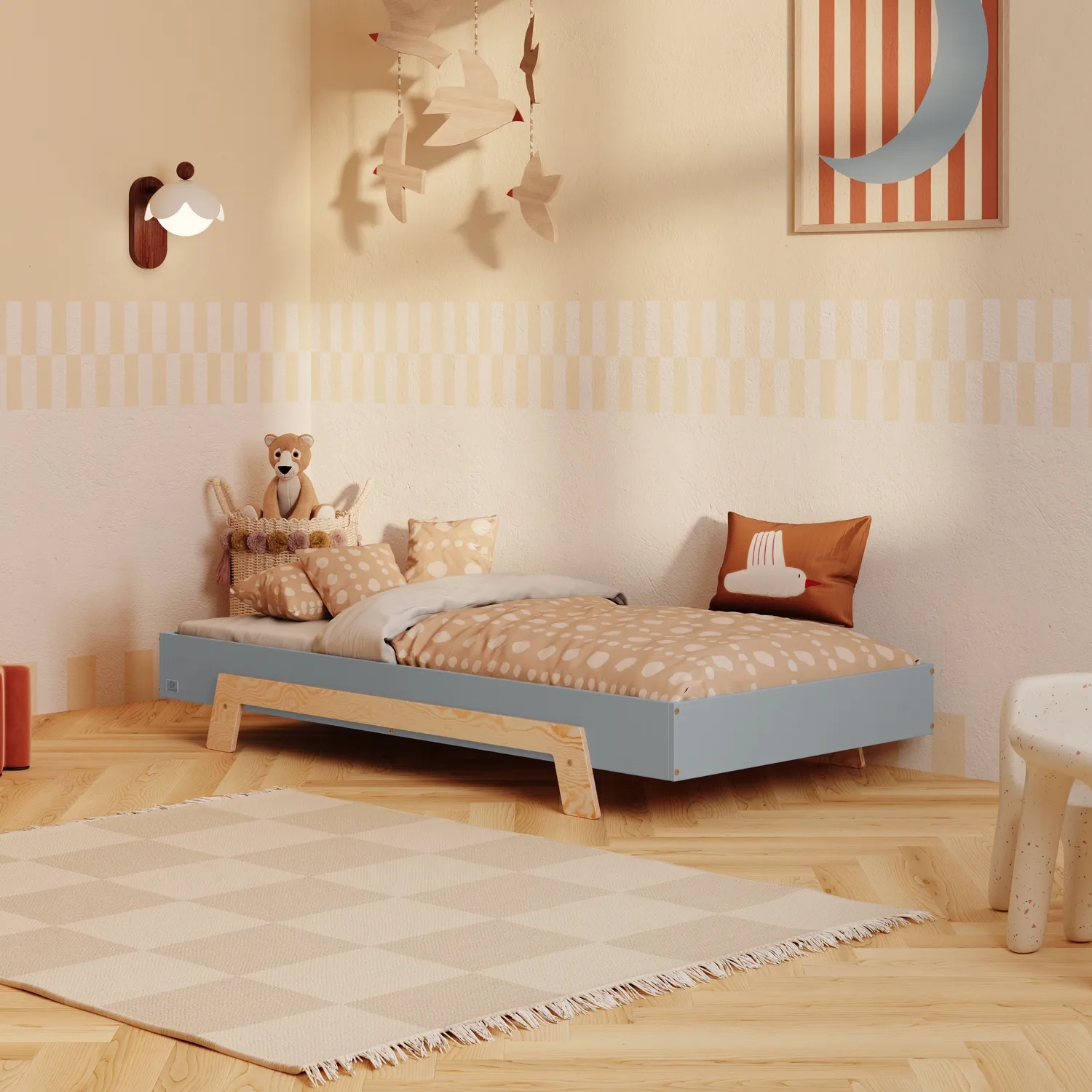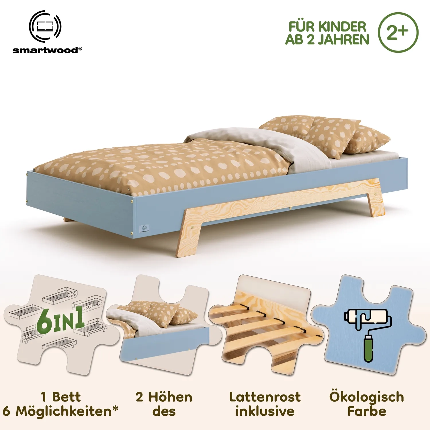 In der Praxis bedeutet das: Ein einziges Bett kann sowohl ein sicheres Bodenschlafplatz für Kleinkinder sein als auch ein „richtiges“, höheres Bett für ältere Kinder.