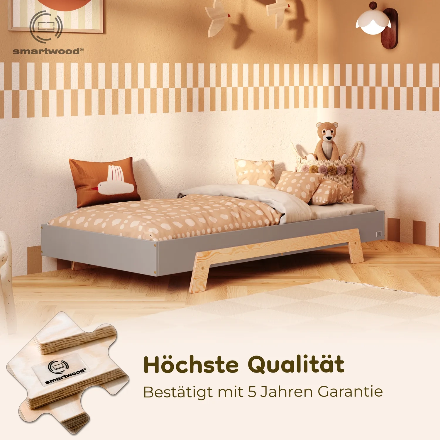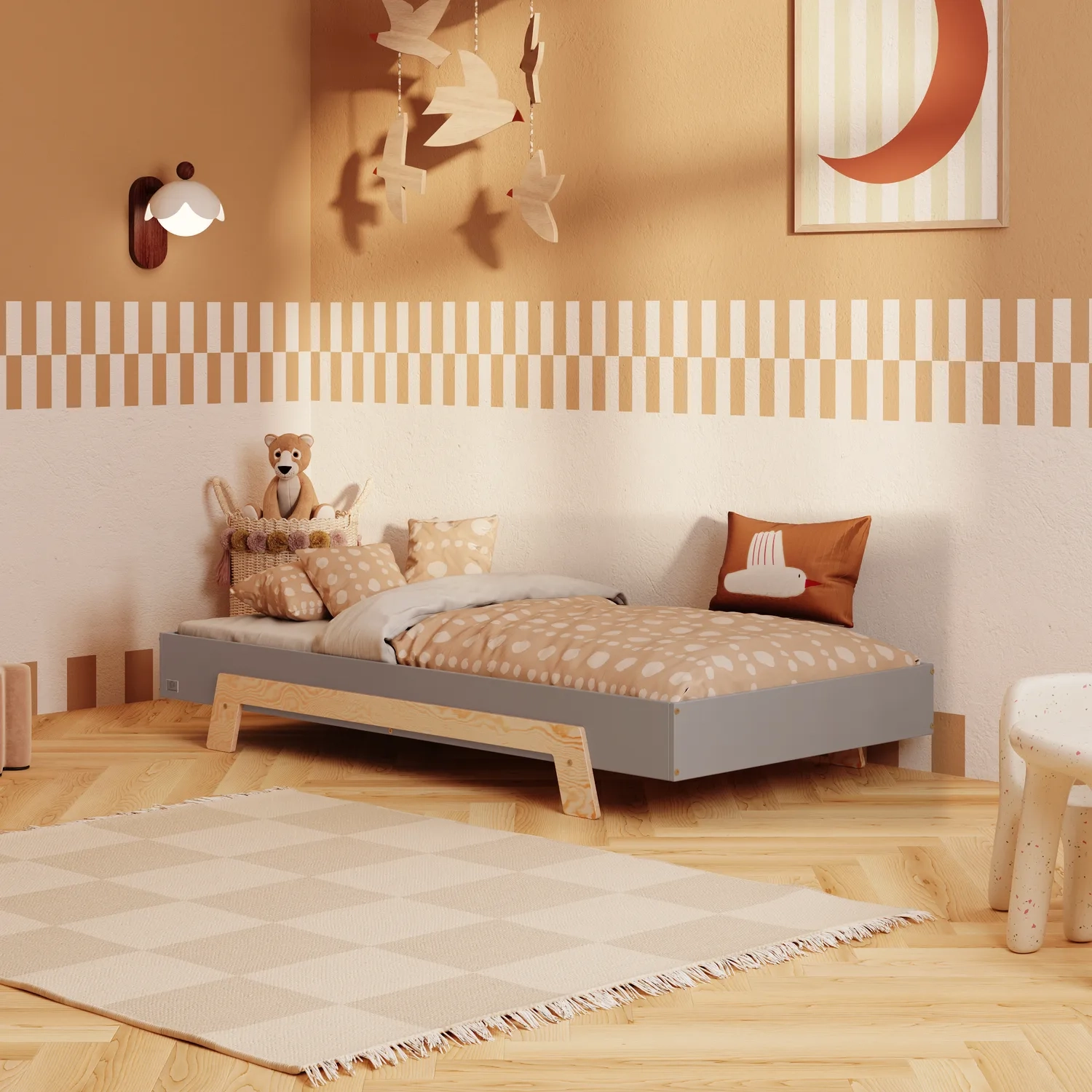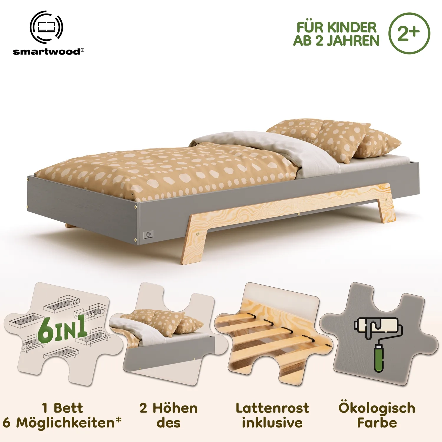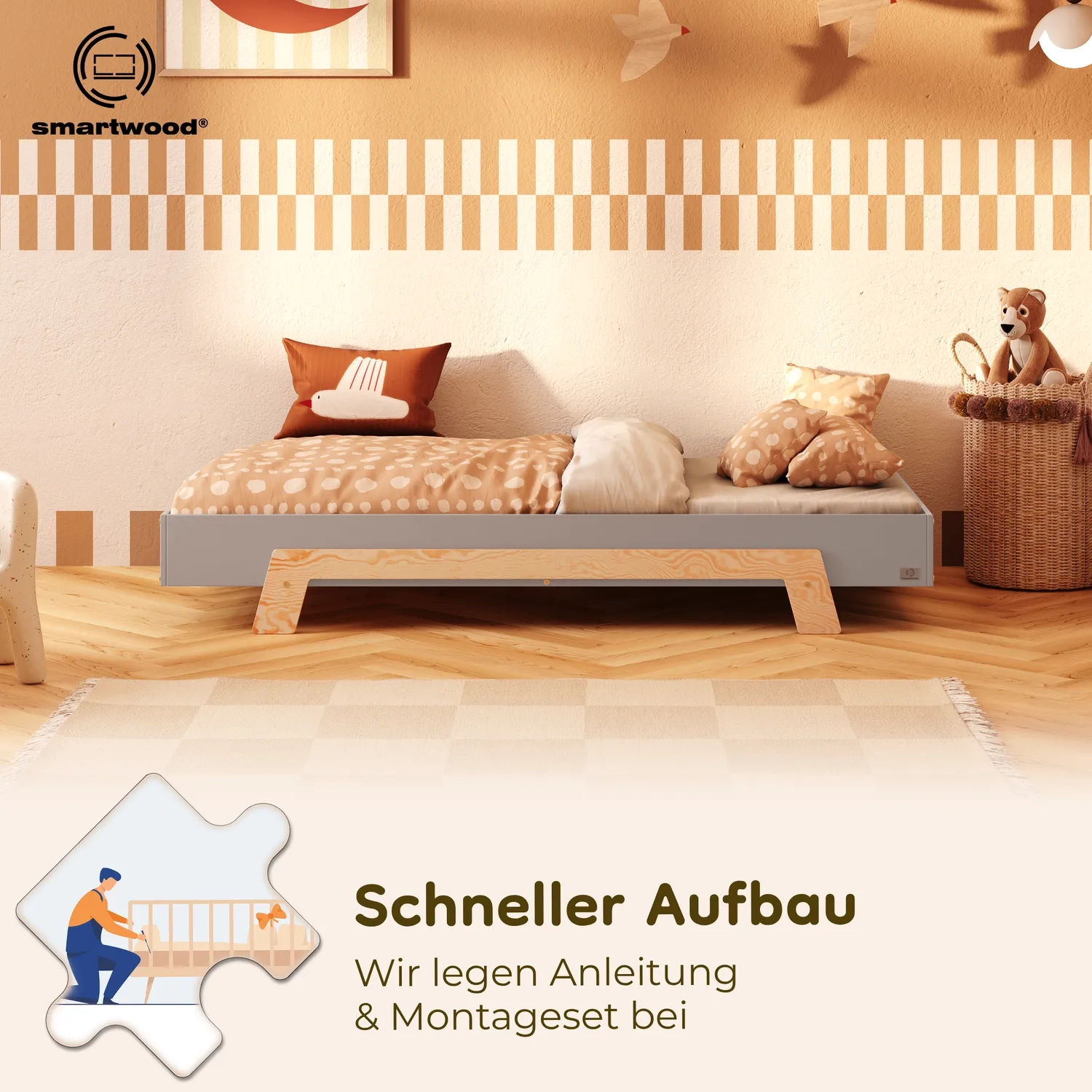 In der Praxis bedeutet das: Ein einziges Bett kann sowohl ein sicheres Bodenschlafplatz für Kleinkinder sein als auch ein „richtiges“, höheres Bett für ältere Kinder.
