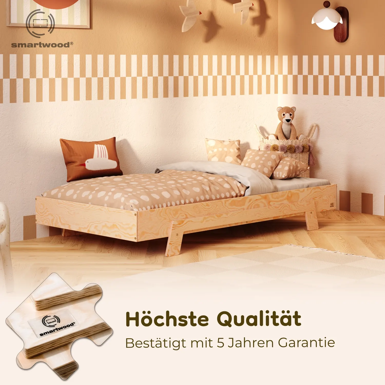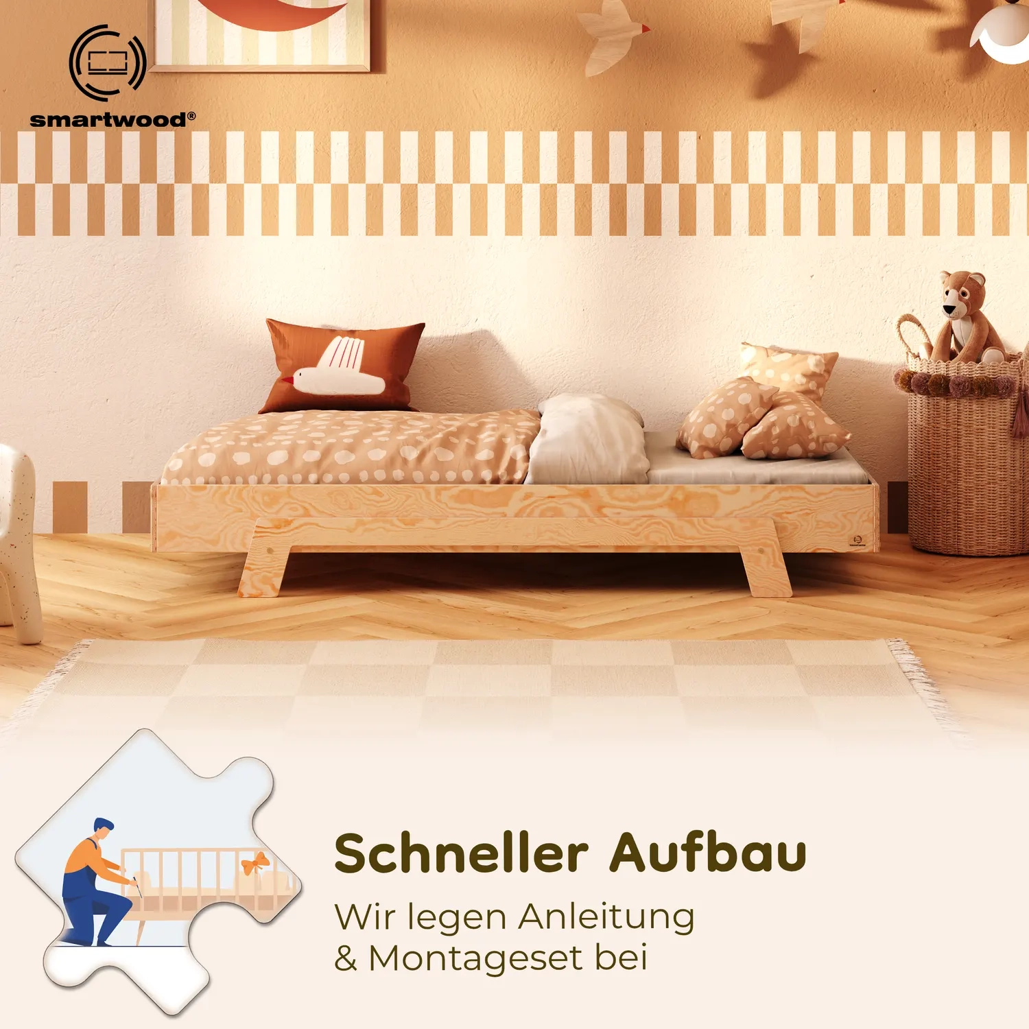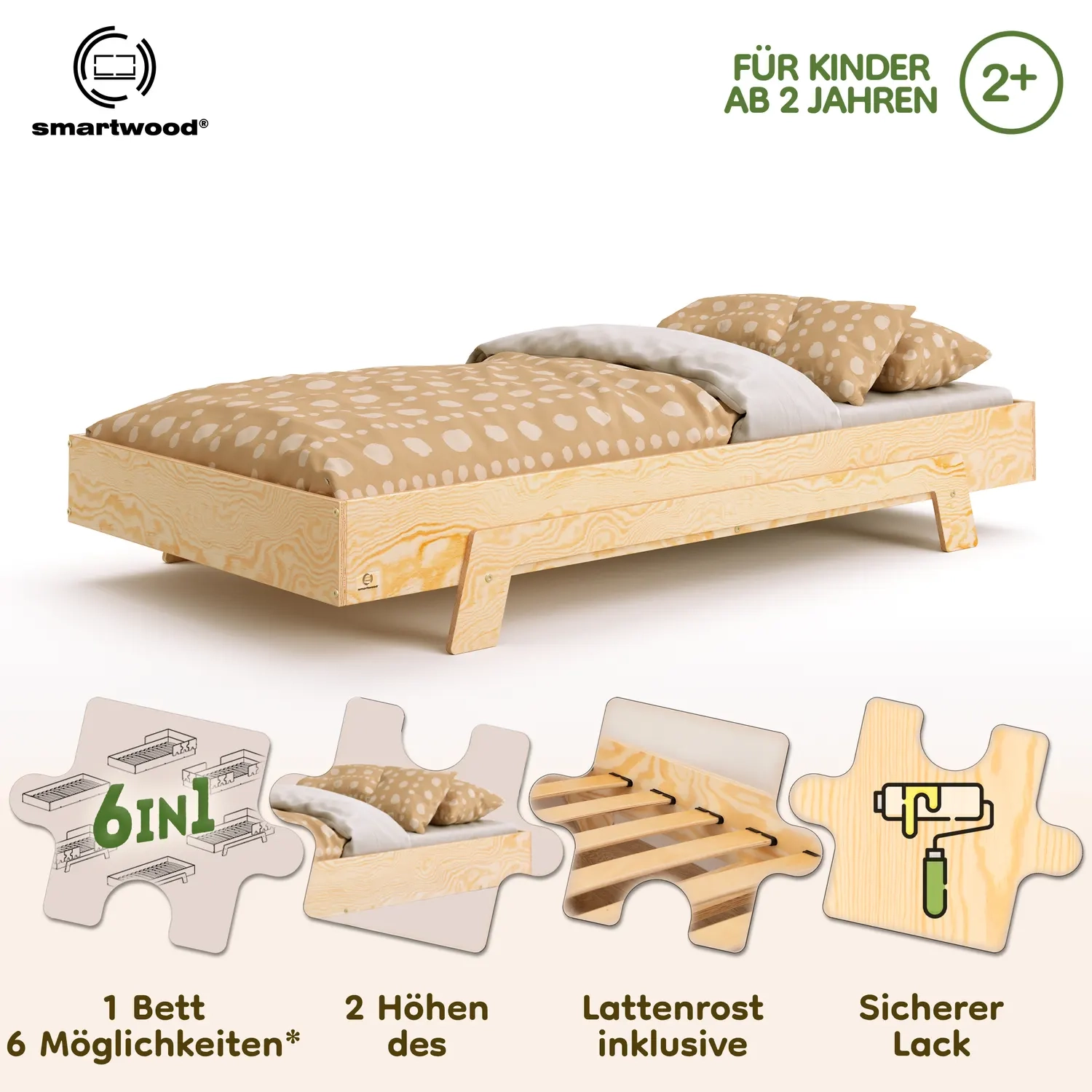 In der Praxis bedeutet das: Ein einziges Bett kann sowohl ein sicheres Bodenschlafplatz für Kleinkinder sein als auch ein „richtiges“, höheres Bett für ältere Kinder.