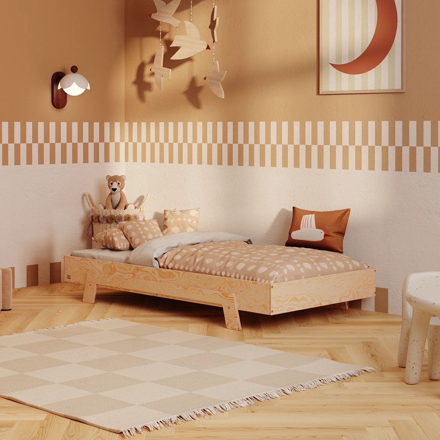 Die minimalistische Form lässt mehr Raum für Bettwäsche, Kissen und Deko, die zu den aktuellen Interessen des Kindes passen. Perfekt, wenn dein Kind aus den „typisch kindlichen“ Motiven herausgewachsen ist.