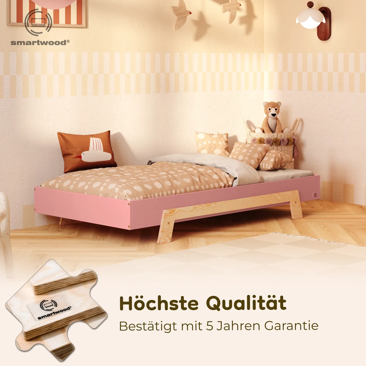 In der Praxis bedeutet das: Ein einziges Bett kann sowohl ein sicheres Bodenschlafplatz für Kleinkinder sein als auch ein „richtiges“, höheres Bett für ältere Kinder.