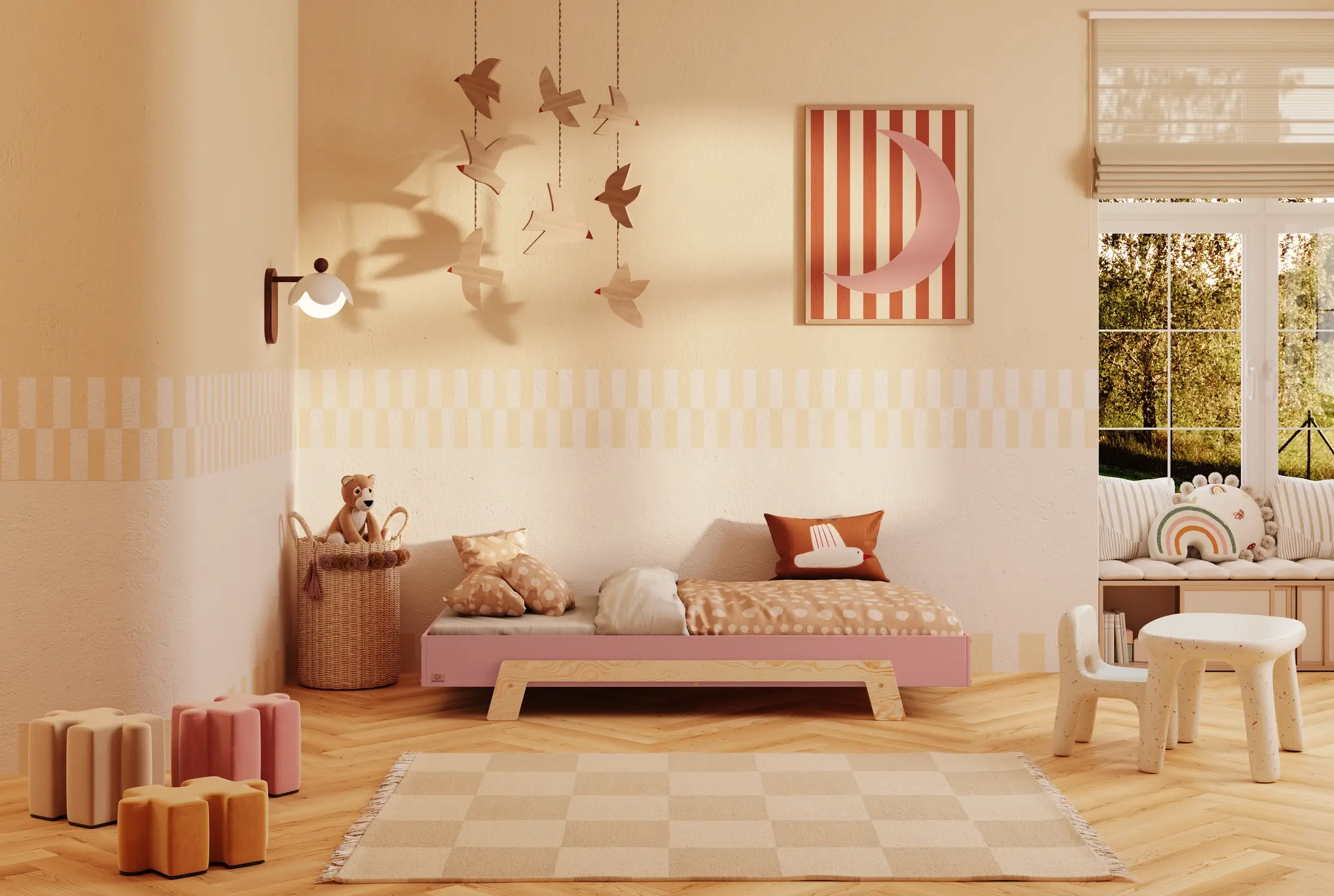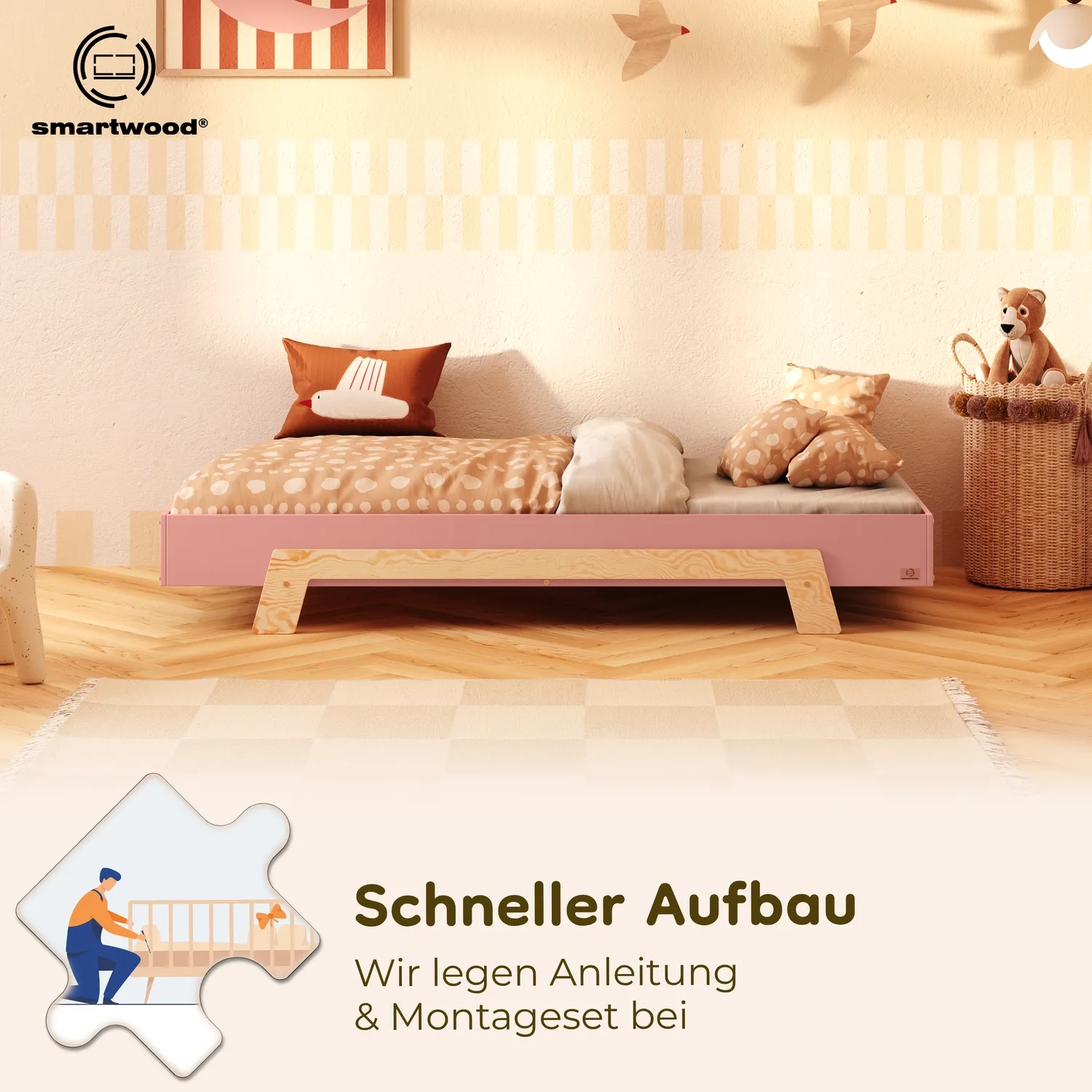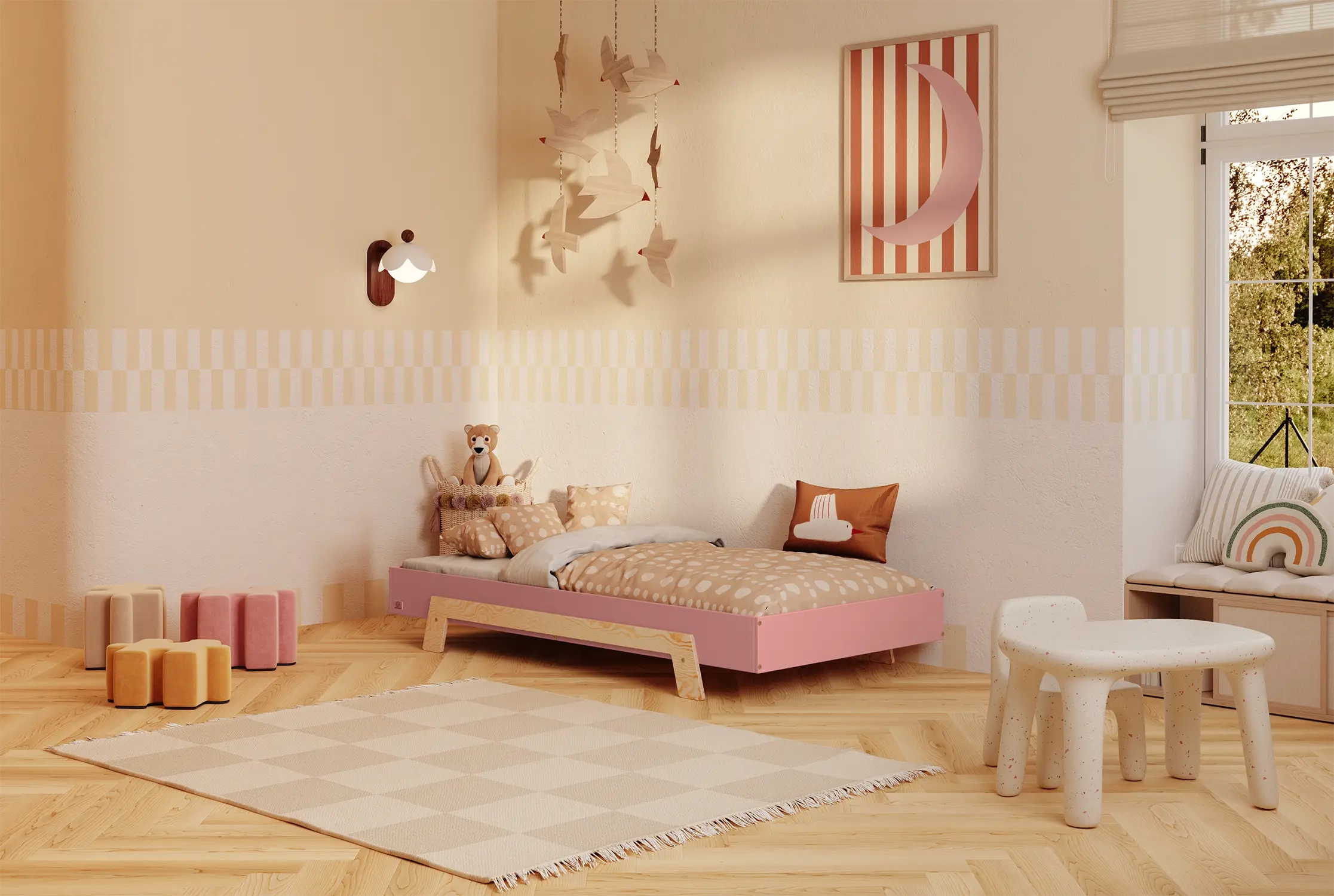 Die minimalistische Form lässt mehr Raum für Bettwäsche, Kissen und Deko, die zu den aktuellen Interessen des Kindes passen. Perfekt, wenn dein Kind aus den „typisch kindlichen“ Motiven herausgewachsen ist.