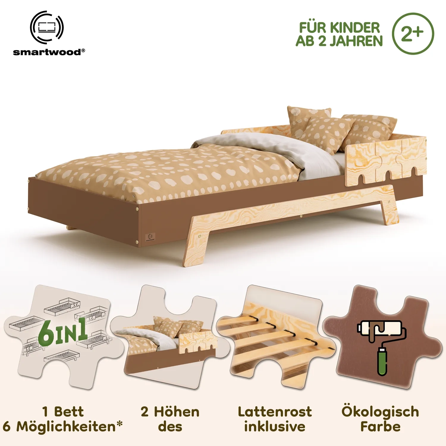 In der Praxis bedeutet das: Ein einziges Bett kann sowohl ein sicheres Bodenschlafplatz für Kleinkinder sein als auch ein „richtiges“, höheres Bett für ältere Kinder.