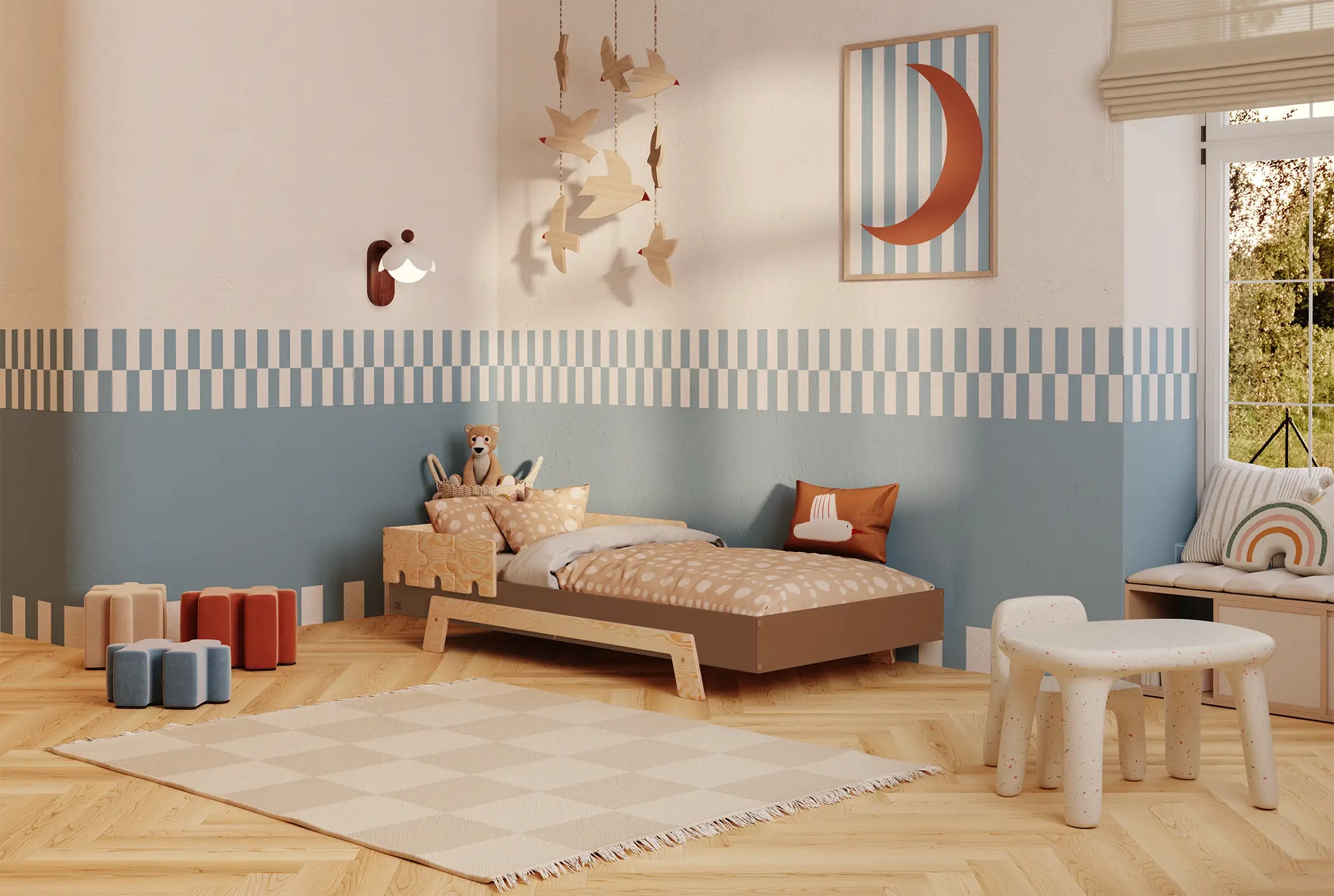 Das PUZZLE-Bett ist ein modulares Möbelstück, das du ganz einfach an das Alter, Temperament und die Entwicklungsphase deines Kindes anpasst.