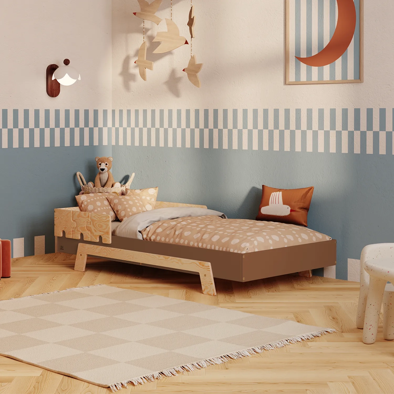 Einzelbett für Kinder mit Rausfallschutz und Lattenrost PUZZLE BR1 Montessori Holz