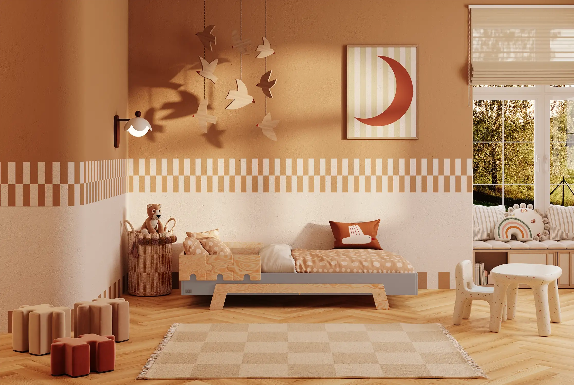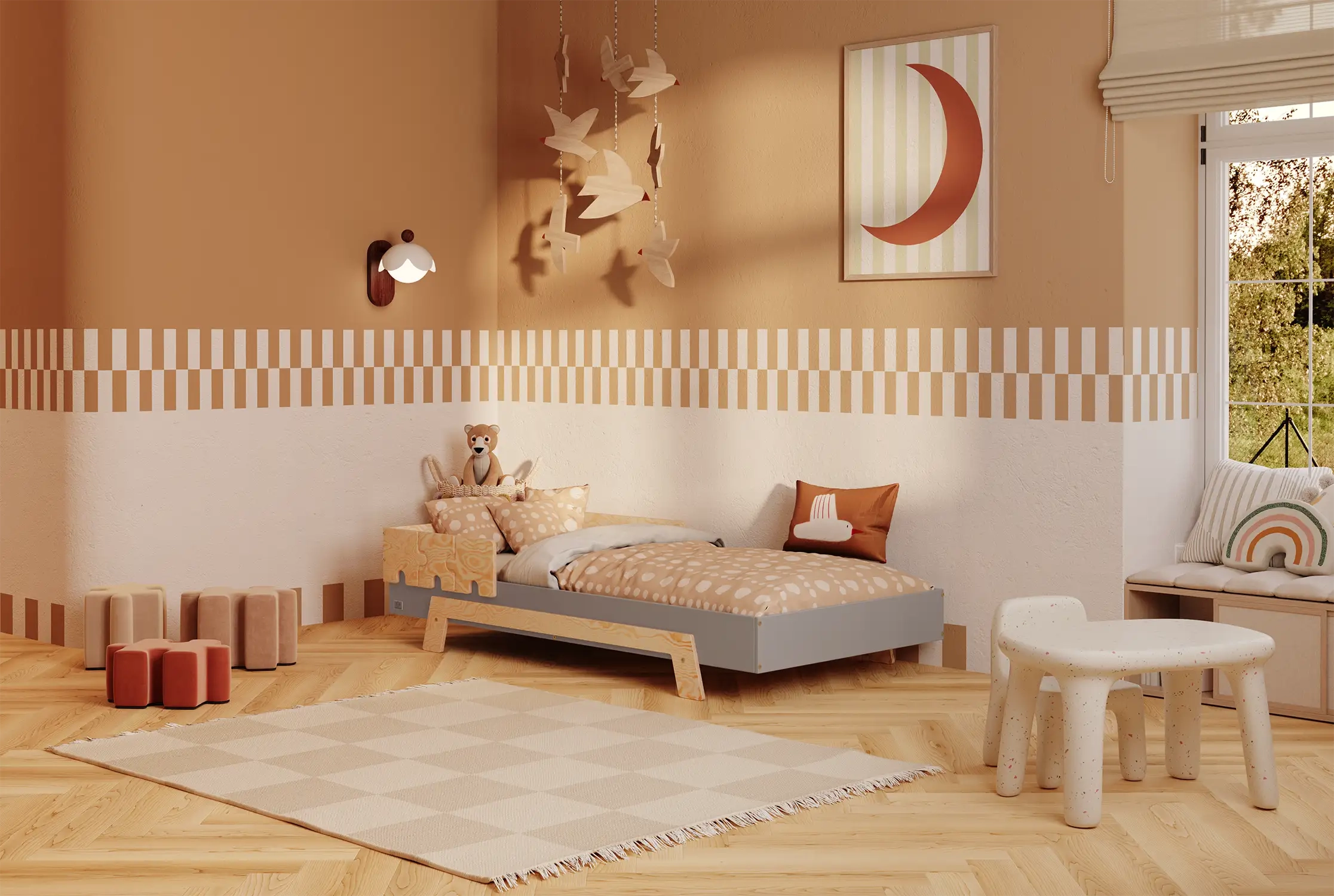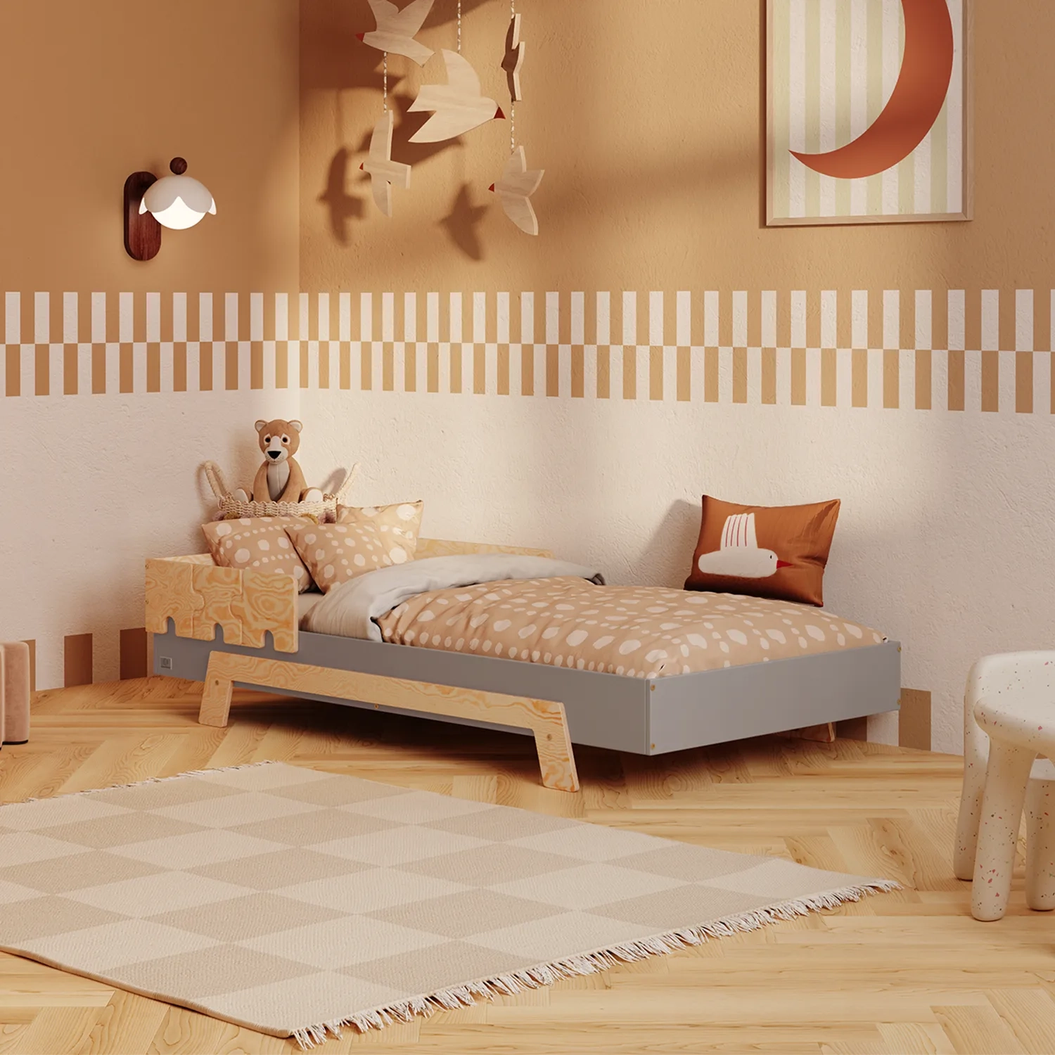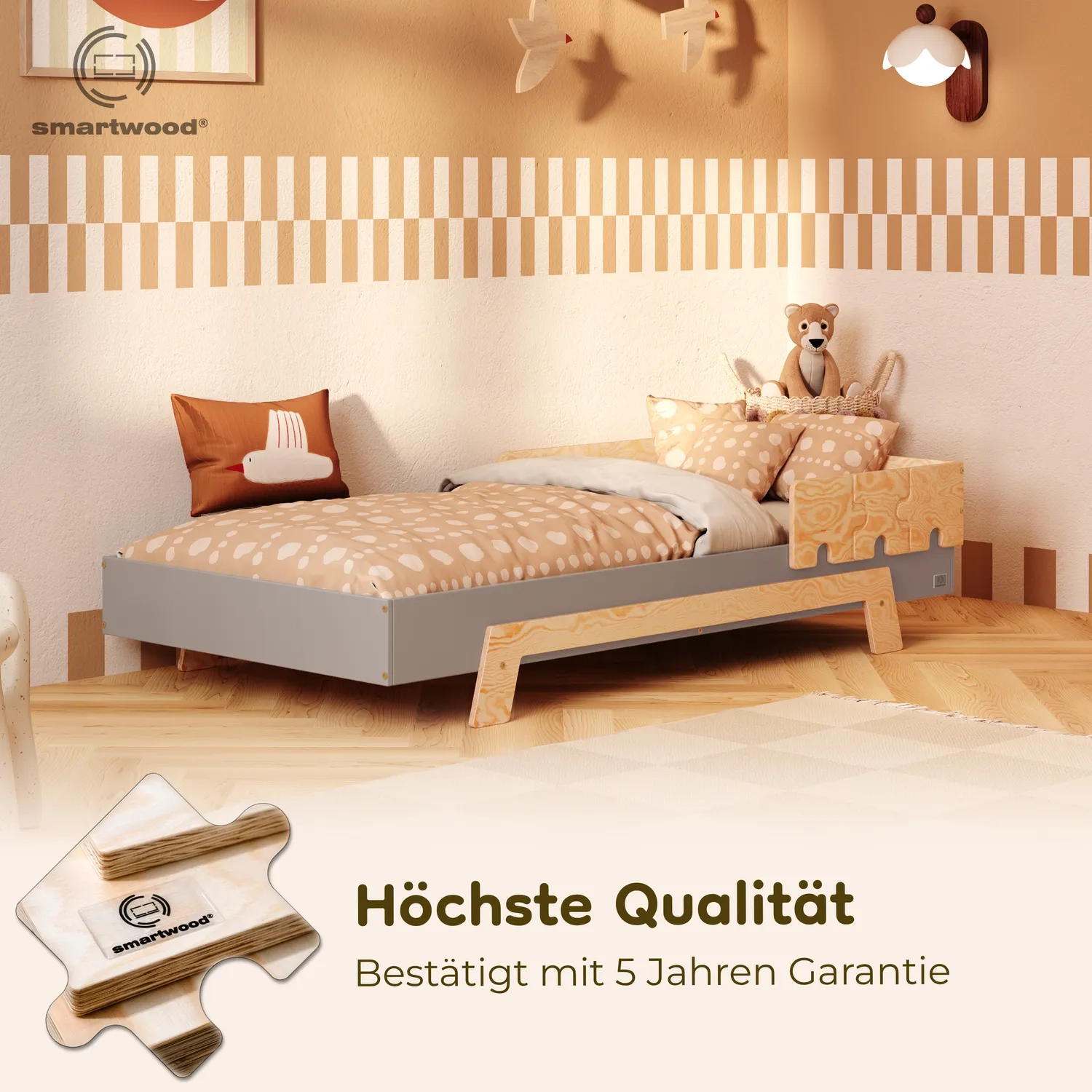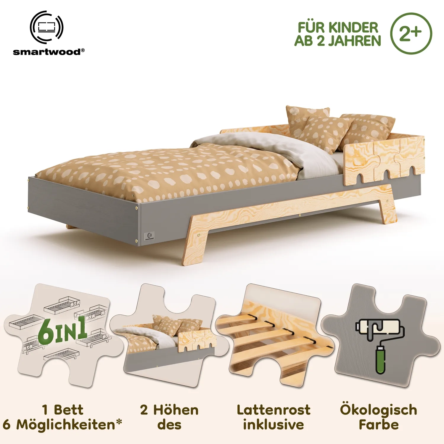 In der Praxis bedeutet das: Ein einziges Bett kann sowohl ein sicheres Bodenschlafplatz für Kleinkinder sein als auch ein „richtiges“, höheres Bett für ältere Kinder.