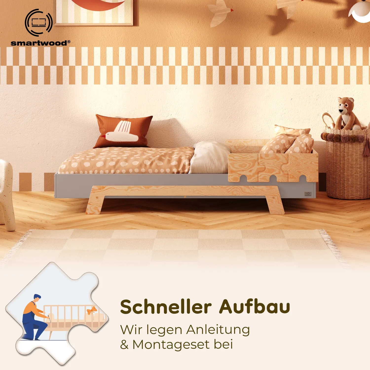 Die minimalistische Form lässt mehr Raum für Bettwäsche, Kissen und Deko, die zu den aktuellen Interessen des Kindes passen. Perfekt, wenn dein Kind aus den „typisch kindlichen“ Motiven herausgewachsen ist.