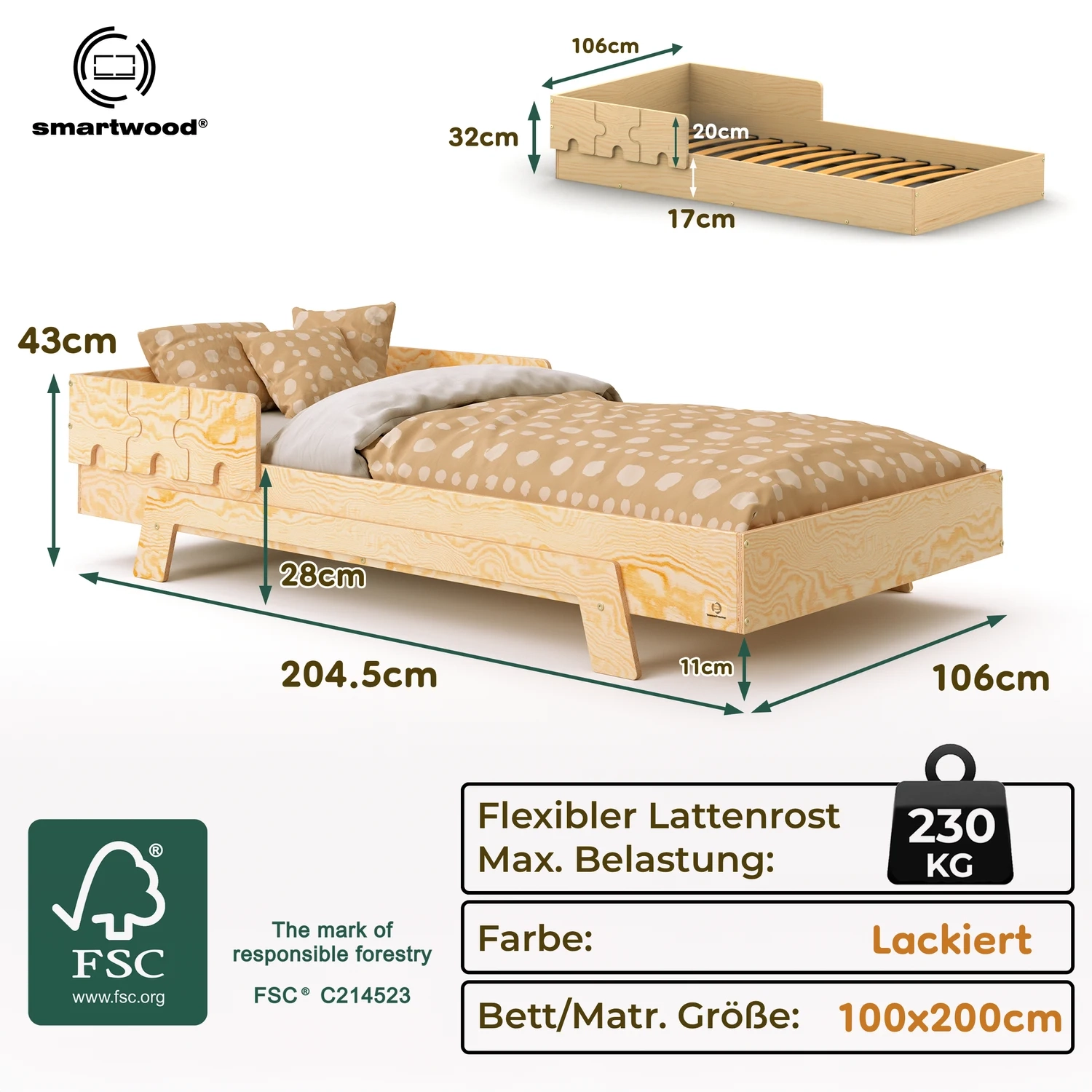 Einzelbett für Kinder mit Rausfallschutz und Lattenrost PUZZLE BR1 Montessori Holz