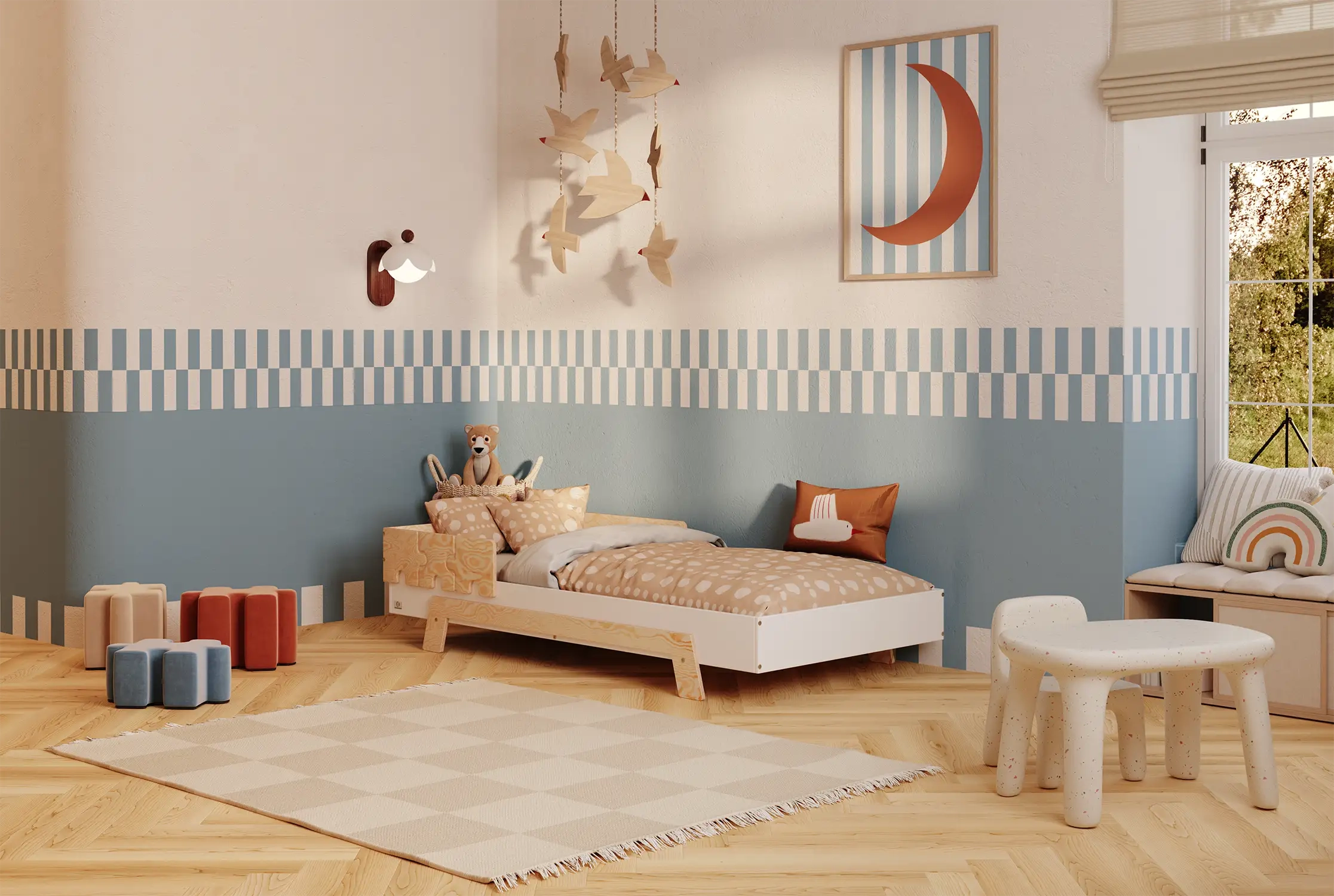 Die minimalistische Form lässt mehr Raum für Bettwäsche, Kissen und Deko, die zu den aktuellen Interessen des Kindes passen. Perfekt, wenn dein Kind aus den „typisch kindlichen“ Motiven herausgewachsen ist.