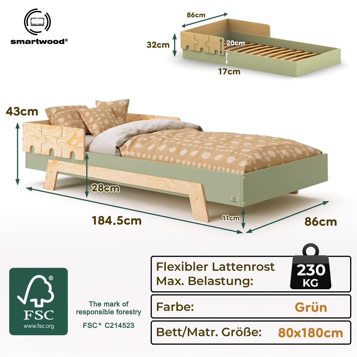 In der Praxis bedeutet das: Ein einziges Bett kann sowohl ein sicheres Bodenschlafplatz für Kleinkinder sein als auch ein „richtiges“, höheres Bett für ältere Kinder.