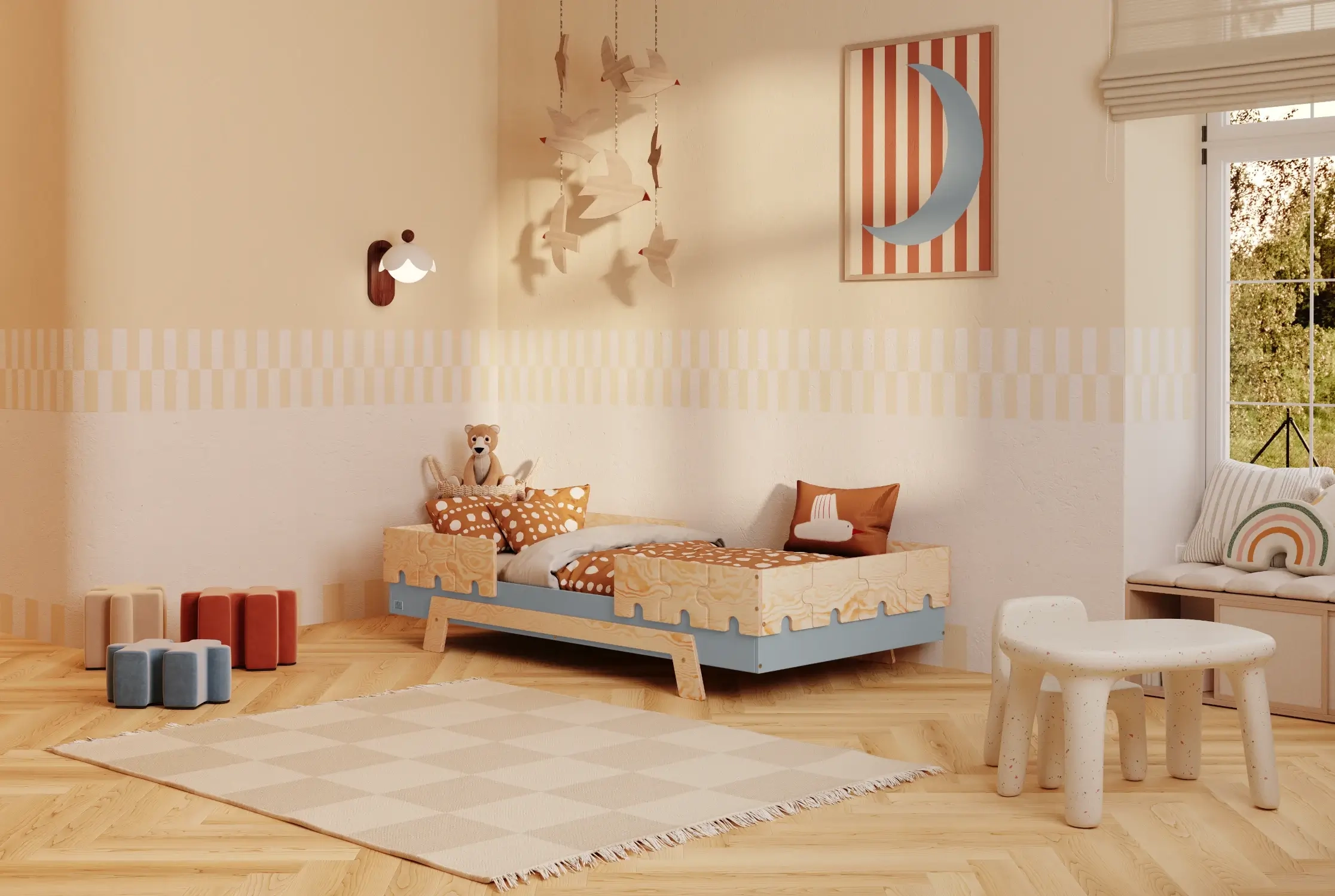 Eine perfekte Basis für eine minimalistische Schlafecke oder eine gemütliche Relaxzone. Die niedrige Konstruktion bleibt kindgerecht sicher und bietet volle Bewegungsfreiheit.