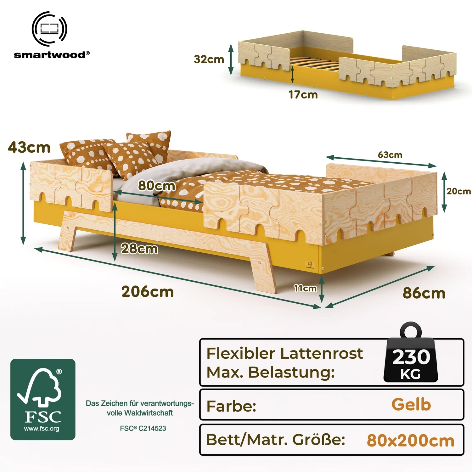 PUZZLE BR2 Bett ist die perfekte Lösung für Kinder, die kreatives Design mit Funktionalität verbindet. Ausgestattet mit zwei Geländern in Form von Puzzleteilen bietet es vollständigen Schutz beim Schlafen und die soliden Beine verleihen der Konstruktion Stabilität. Hergestellt aus hochwertigem Kiefernsperrholz garantiert es Langlebigkeit und Sicherheit im Gebrauch. Wenn dein Kind sich ein „erwachseneres“ Zimmer wünscht, kannst du die Geländer einfach entfernen und das minimalistische Design genießen. Das Bett ist in 9 Farben und 13 Größen erhältlich, sodass es sich perfekt in jedes Zimmer einfügt. Der inklusive Lattenrost mit der max. Belastbarkeit bis 230 kg macht das Bett sofort nach dem Zusammenbau einsatzbereit.