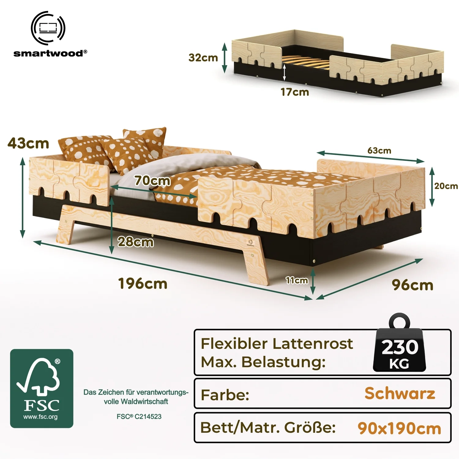 Einzelbett für Kinder mit Rausfallschutz und Lattenrost PUZZLE BR2 Montessori Holz