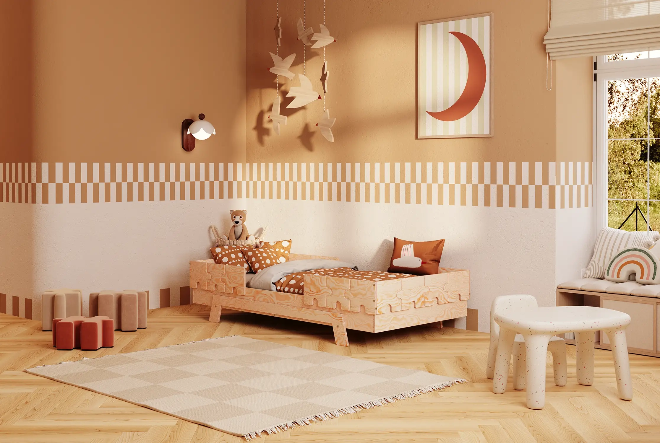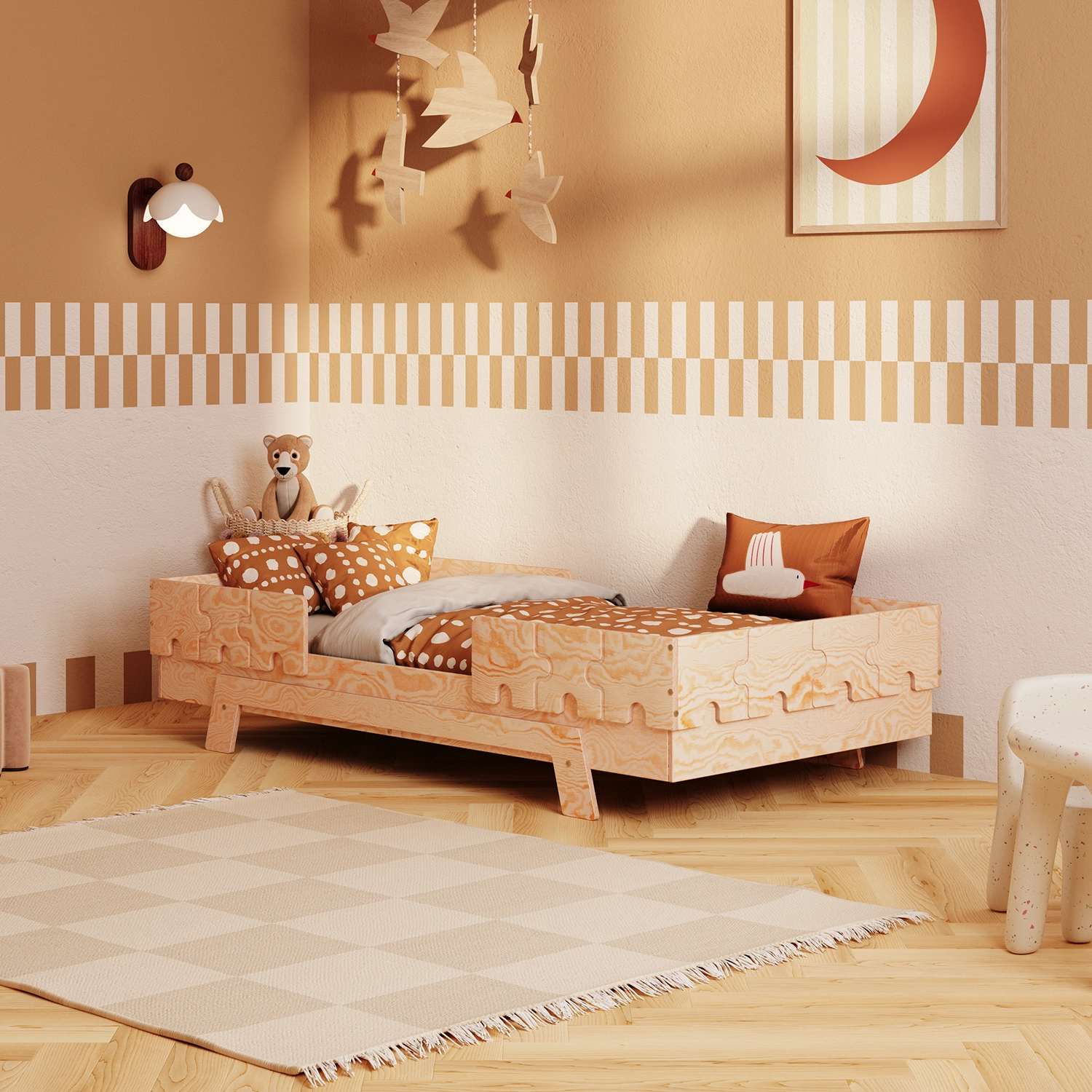 Das PUZZLE-Bett ist ein modulares Möbelstück, das du ganz einfach an das Alter, Temperament und die Entwicklungsphase deines Kindes anpasst.