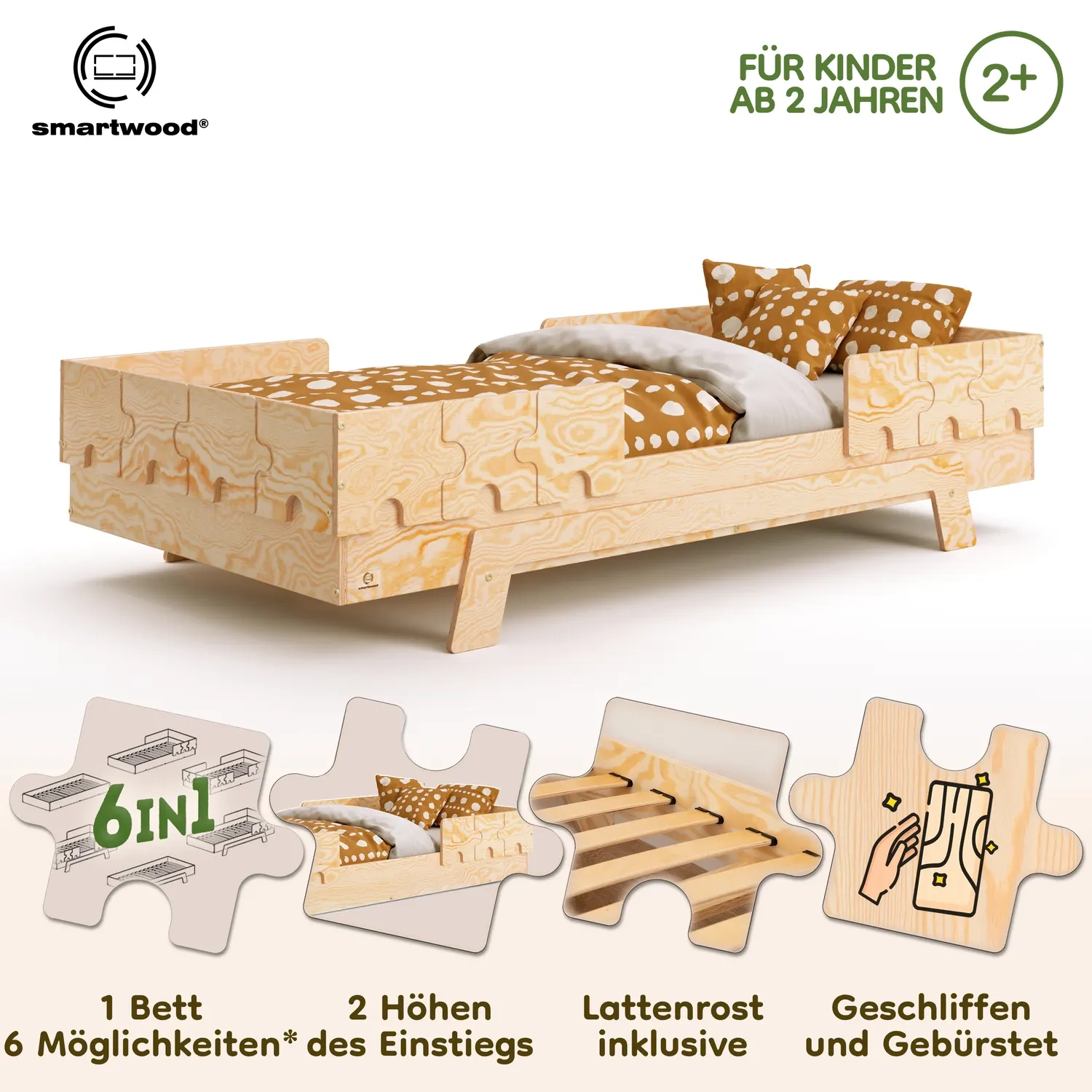 In der Praxis bedeutet das: Ein einziges Bett kann sowohl ein sicheres Bodenschlafplatz für Kleinkinder sein als auch ein „richtiges“, höheres Bett für ältere Kinder.