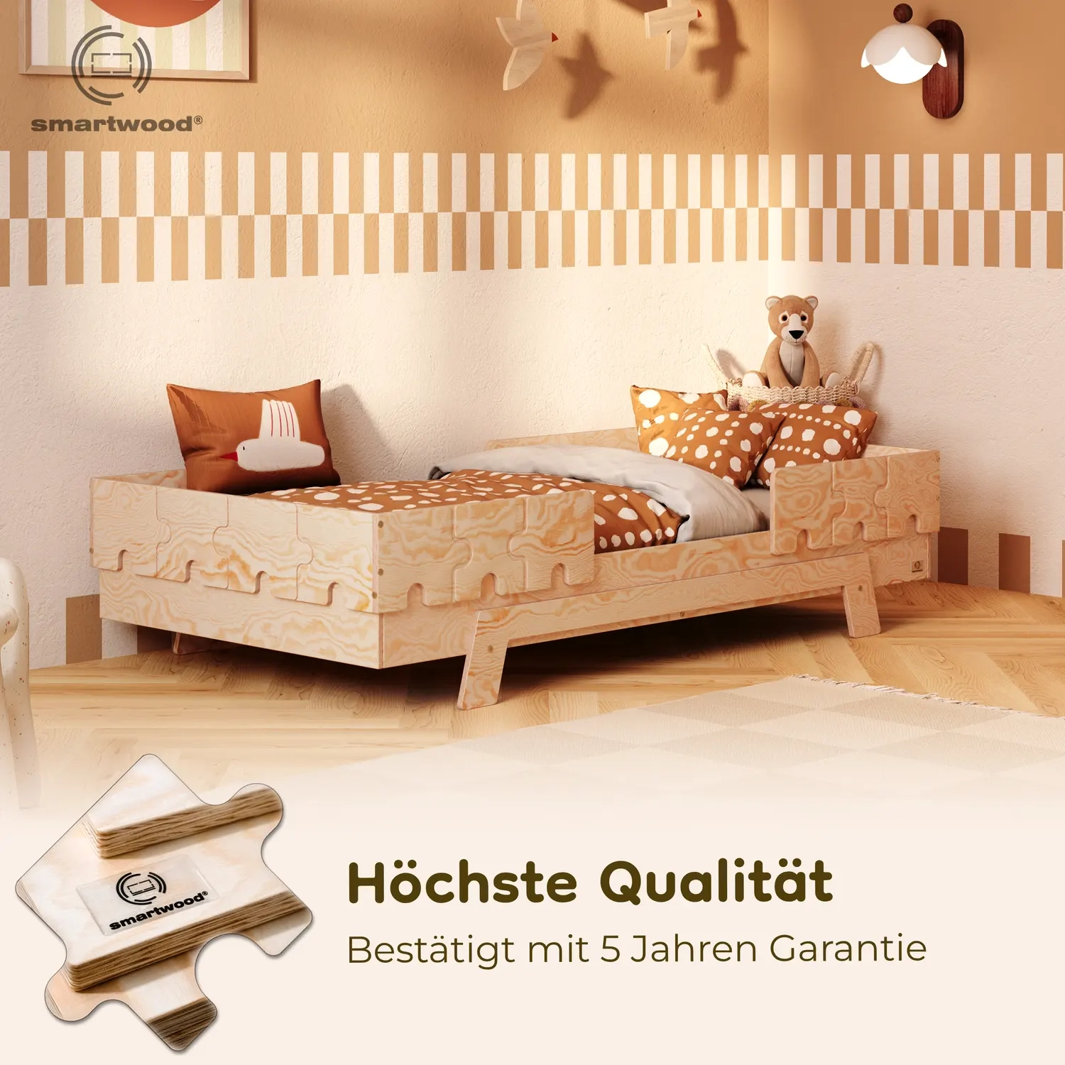 Ideal für Eltern, die größtmögliche Sicherheit und Komfort möchten. Die erhöhte Liegefläche und die Puzzle-Geländer schützen vor dem Herausfallen und schaffen gleichzeitig eine besondere, märchenhafte Atmosphäre im Kinderzimmer.