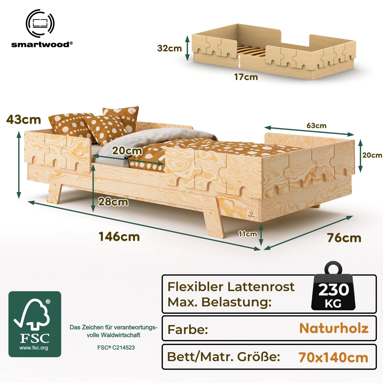 Die niedrige Höhe minimiert das Sturzrisiko, und die rundum geschützten Seiten geben besonders lebhaften Kindern maximale Sicherheit.