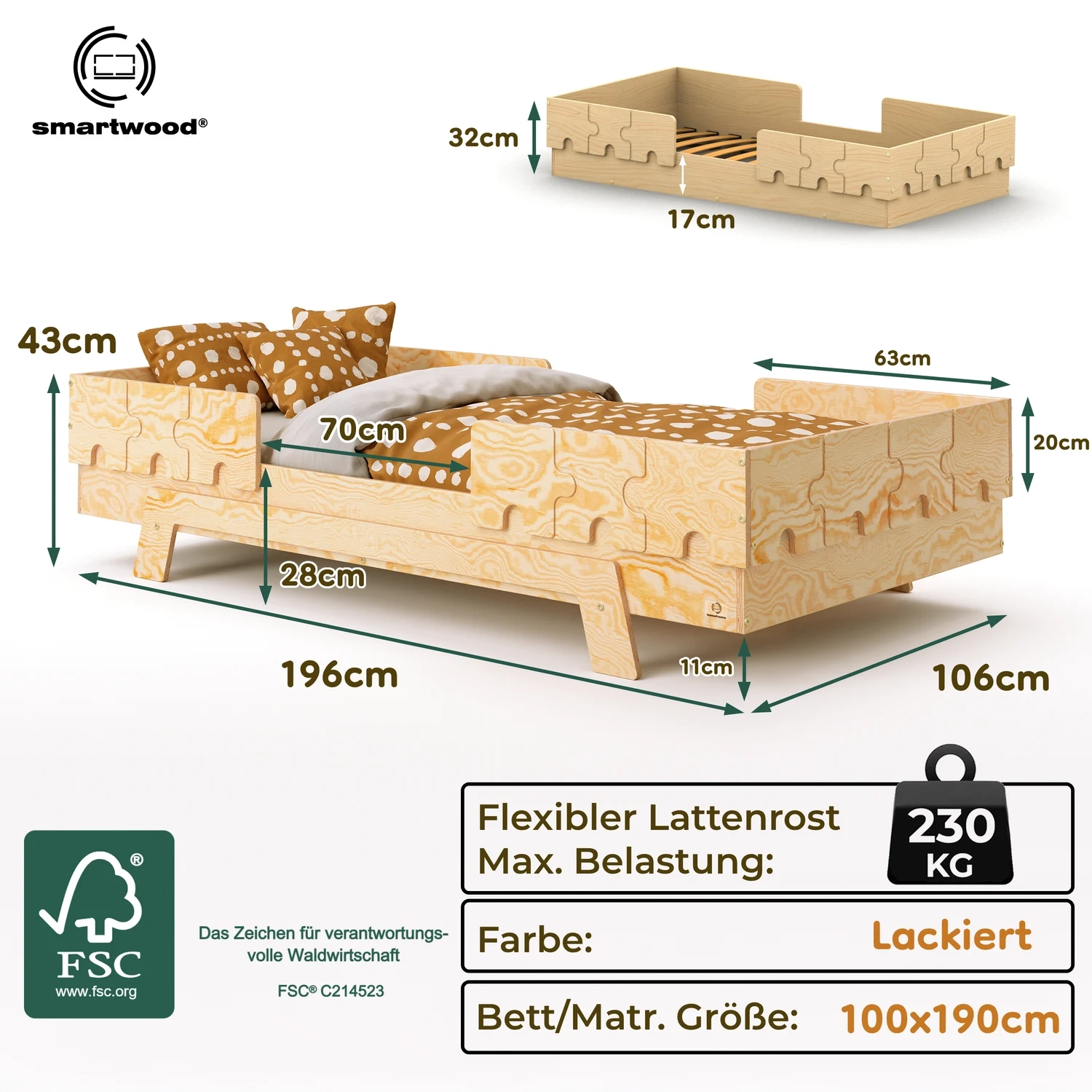 In der Praxis bedeutet das: Ein einziges Bett kann sowohl ein sicheres Bodenschlafplatz für Kleinkinder sein als auch ein „richtiges“, höheres Bett für ältere Kinder.