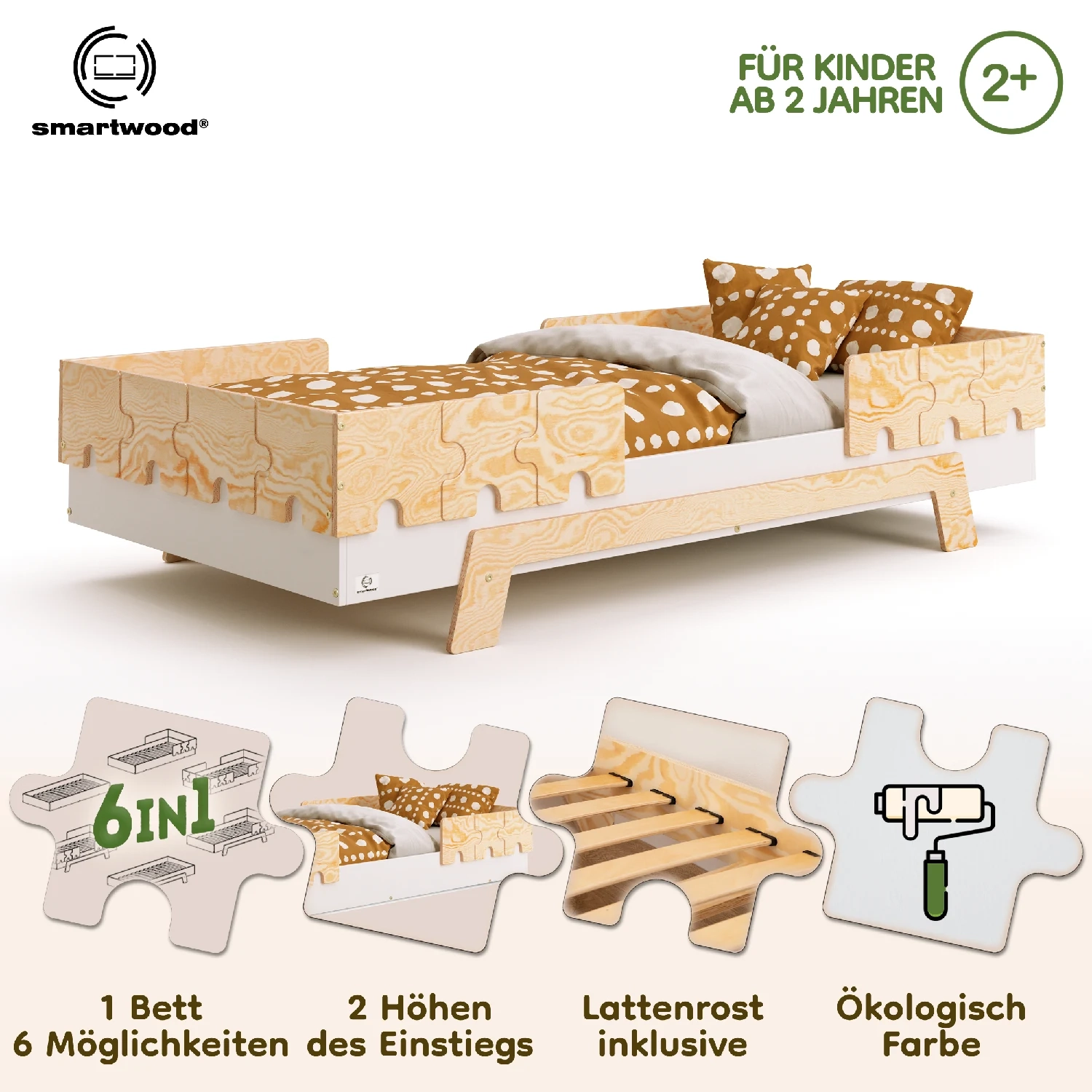 In der Praxis bedeutet das: Ein einziges Bett kann sowohl ein sicheres Bodenschlafplatz für Kleinkinder sein als auch ein „richtiges“, höheres Bett für ältere Kinder.