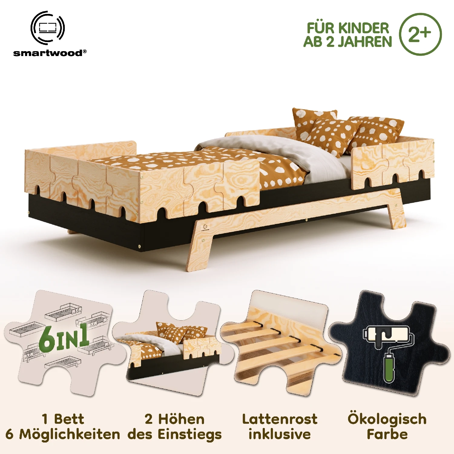 Einzelbett für Kinder mit Rausfallschutz und Lattenrost PUZZLE BR2 Montessori Holz