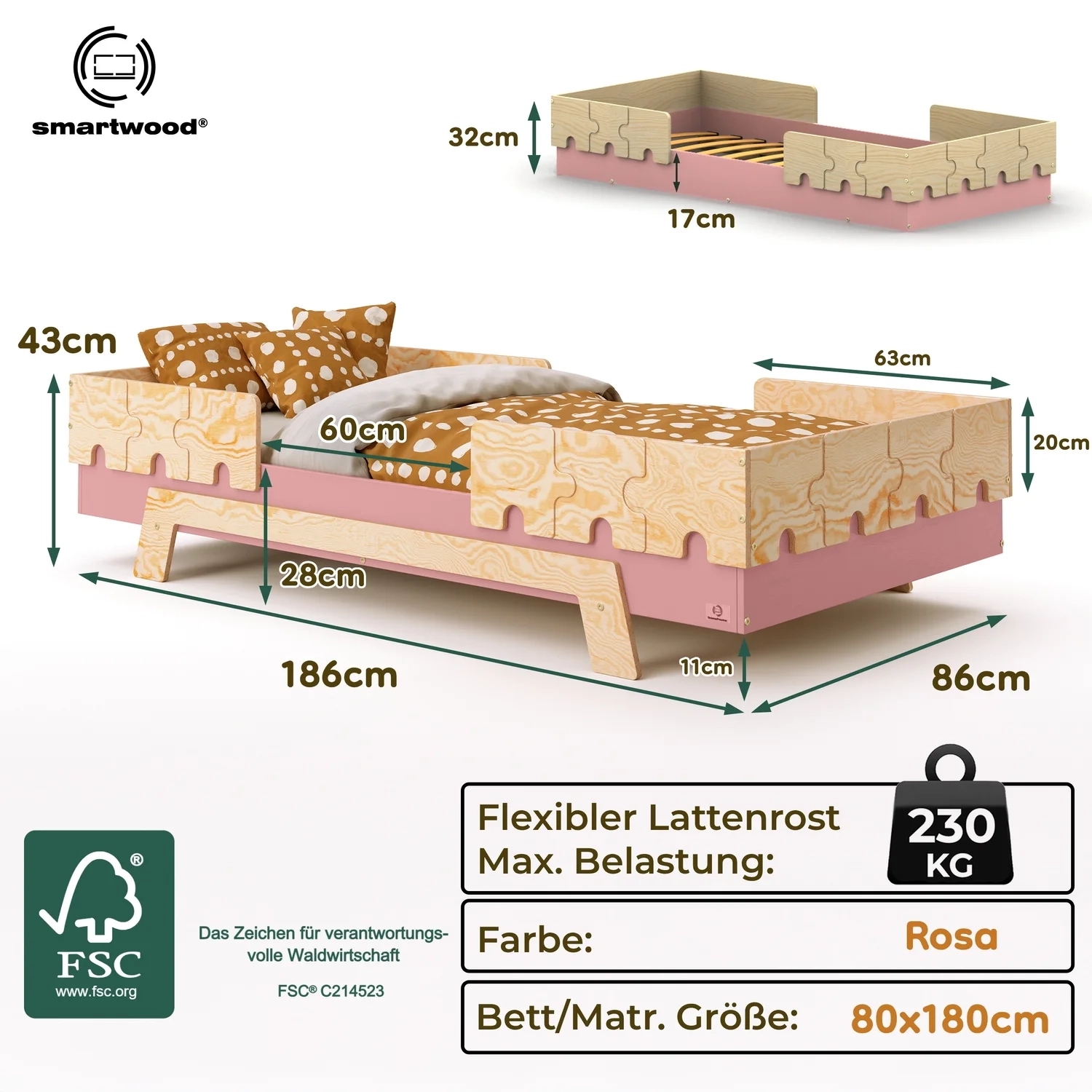 Ideal für Eltern, die größtmögliche Sicherheit und Komfort möchten. Die erhöhte Liegefläche und die Puzzle-Geländer schützen vor dem Herausfallen und schaffen gleichzeitig eine besondere, märchenhafte Atmosphäre im Kinderzimmer.