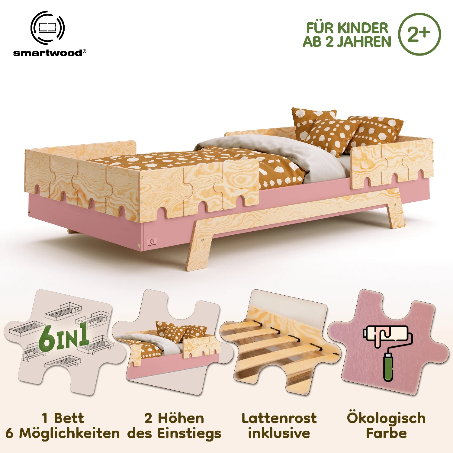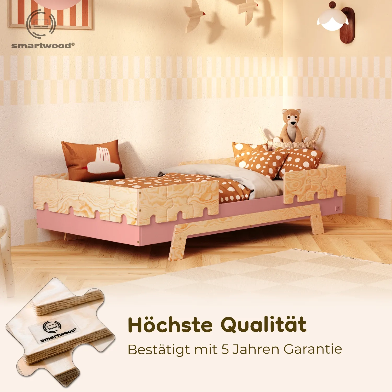 Ideal für Eltern, die größtmögliche Sicherheit und Komfort möchten. Die erhöhte Liegefläche und die Puzzle-Geländer schützen vor dem Herausfallen und schaffen gleichzeitig eine besondere, märchenhafte Atmosphäre im Kinderzimmer.