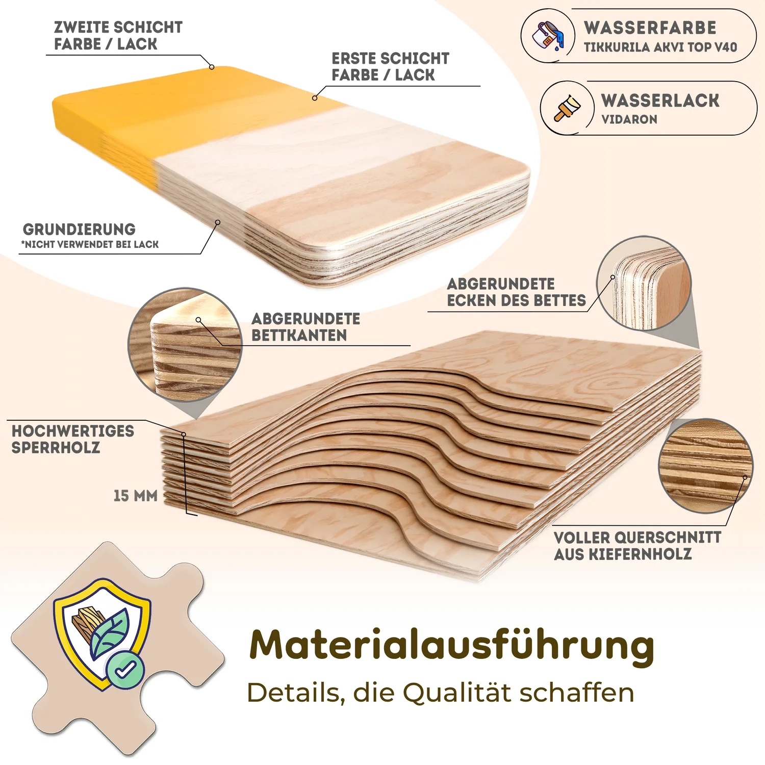 Für die Lackierung verwenden wir den VIDARON Klarlack für Holz. Der Lack unterstreicht nicht nur die natürliche Farbe des Holzes, sondern ist auch speziell für Kinderprodukte geeignet. Er ist sicher für die Kleinsten und erfüllt die strenge europäische Norm EN 71.3 für Spielzeugsicherheit. So bewahrt jedes unserer Produkte nicht nur die Ästhetik des Holzes, sondern gibt Eltern auch die Gewissheit, dass es für ihre Kinder sicher ist. Unser VIDARON-Lack ist eine Garantie für die Haltbarkeit, den Schutz und die schöne Oberfläche der Holzelemente unserer Produkte.