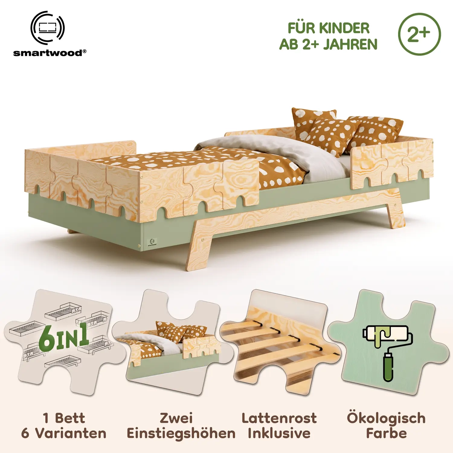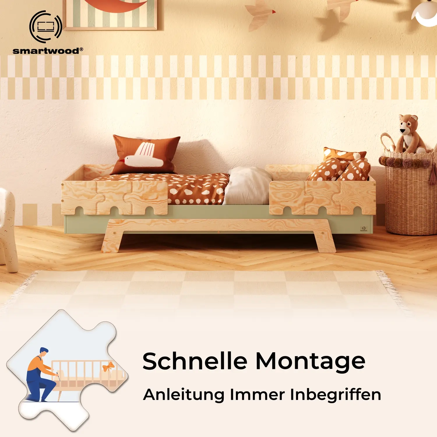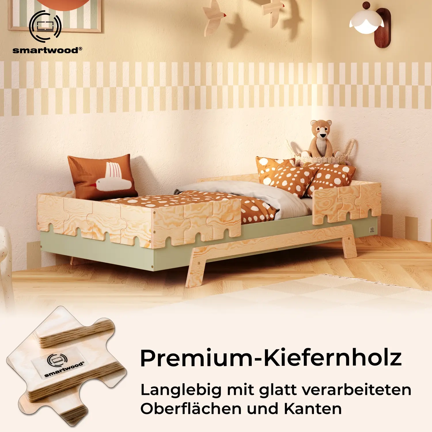 Einzelbett für Kinder mit Rausfallschutz und Lattenrost PUZZLE BR2 Montessori Holz