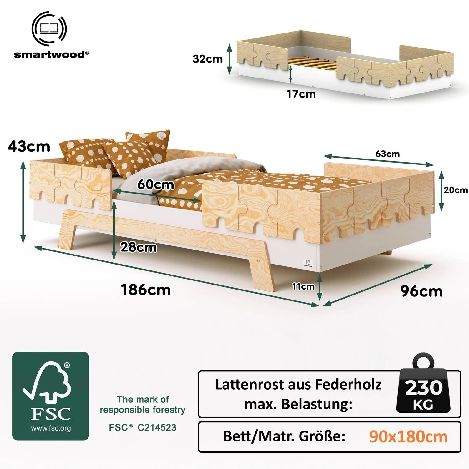 PUZZLE BR2 Bett ist die perfekte Lösung für Kinder, die kreatives Design mit Funktionalität verbindet. Ausgestattet mit zwei Geländern in Form von Puzzleteilen bietet es vollständigen Schutz beim Schlafen und die soliden Beine verleihen der Konstruktion Stabilität. Hergestellt aus hochwertigem Kiefernsperrholz garantiert es Langlebigkeit und Sicherheit im Gebrauch. Wenn dein Kind sich ein „erwachseneres“ Zimmer wünscht, kannst du die Geländer einfach entfernen und das minimalistische Design genießen. Das Bett ist in 9 Farben und 13 Größen erhältlich, sodass es sich perfekt in jedes Zimmer einfügt. Der inklusive Lattenrost mit der max. Belastbarkeit bis 230 kg macht das Bett sofort nach dem Zusammenbau einsatzbereit.