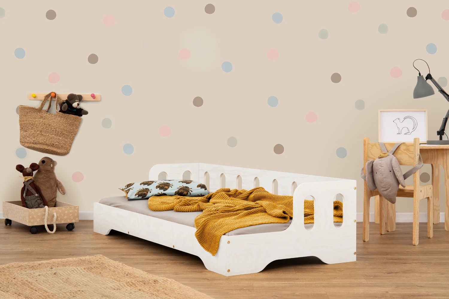 Unser Kinderbett TILA 1S sorgt dafür, dass Ihre Erwartungen erfüllt werden. Es ist nicht nur äußerst komfortabel und sicher, sondern auch stilvoll. Das minimalistische Design passt in fast jede Einrichtung. Die niedrige Höhe des Bettchens ermöglicht einen einfacheren Zugang und die bequeme Nutzung durch das Kind, fördert seine motorischen Fähigkeiten und Unabhängigkeit. Dies ermöglicht Ihrem Kind auch, die Umgebung sicher zu erkunden, seine natürliche Neugier und sein Autonomiegefühl zu entwickeln. Das offene Design erlaubt es, das Bett auch als Sofa zu nutzen, was es noch interessanter in das Kinderzimmer integriert.