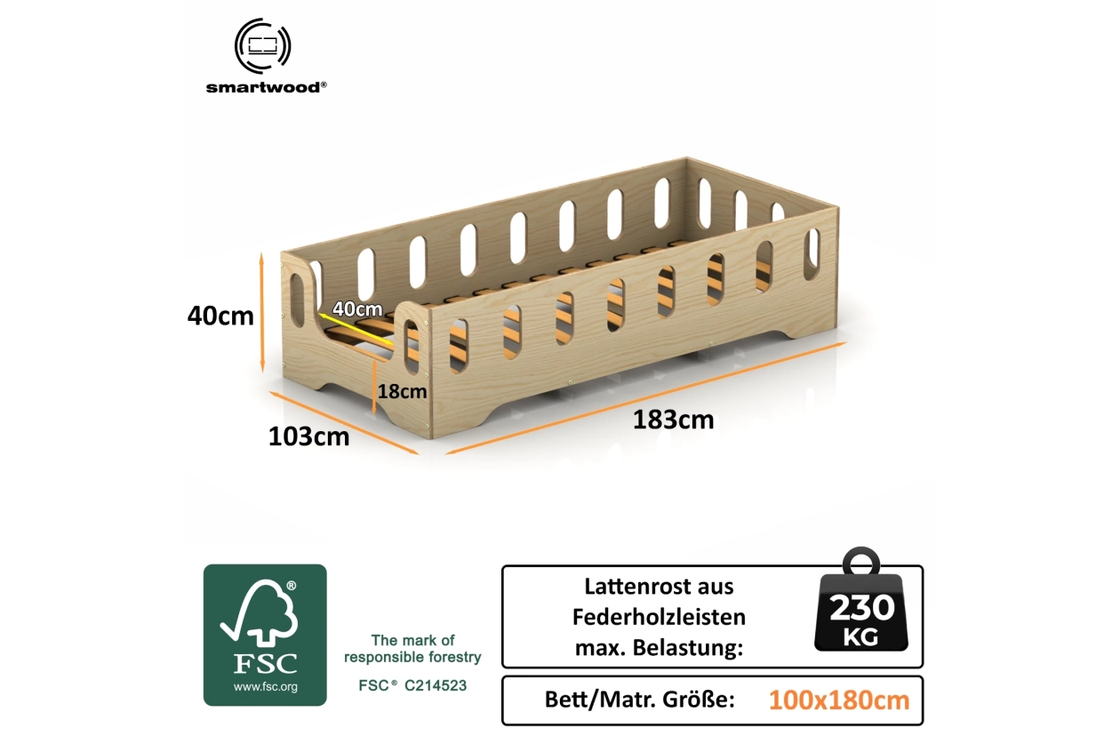 Kleinere Größen haben einen gebogenen Lattenrost, Größen ab 120 cm Breite haben einen geraden Lattenrost.