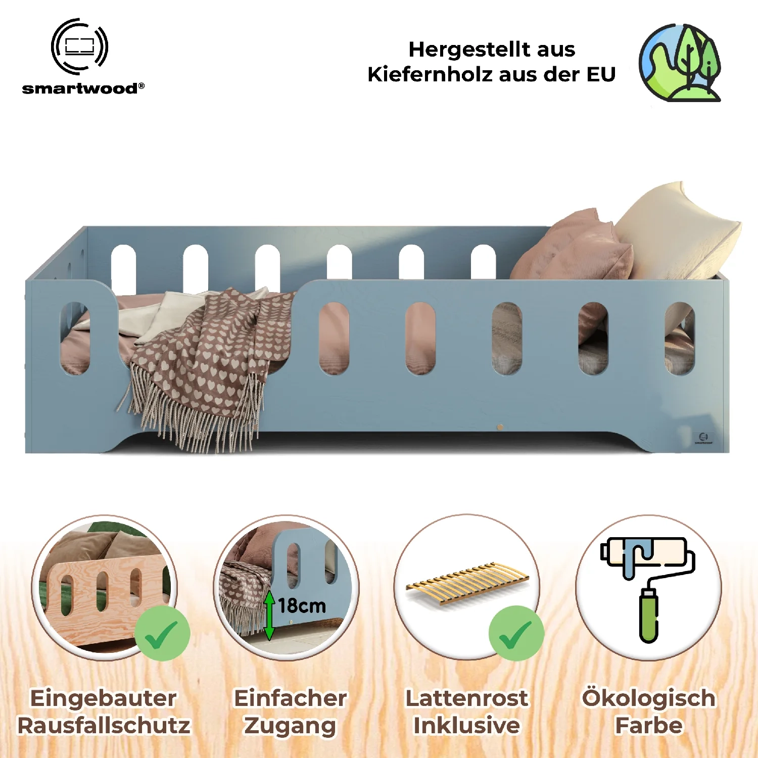 Einzelbett für Kinder mit Rausfallschutz und Lattenrost TILA 2 Montessori Holz