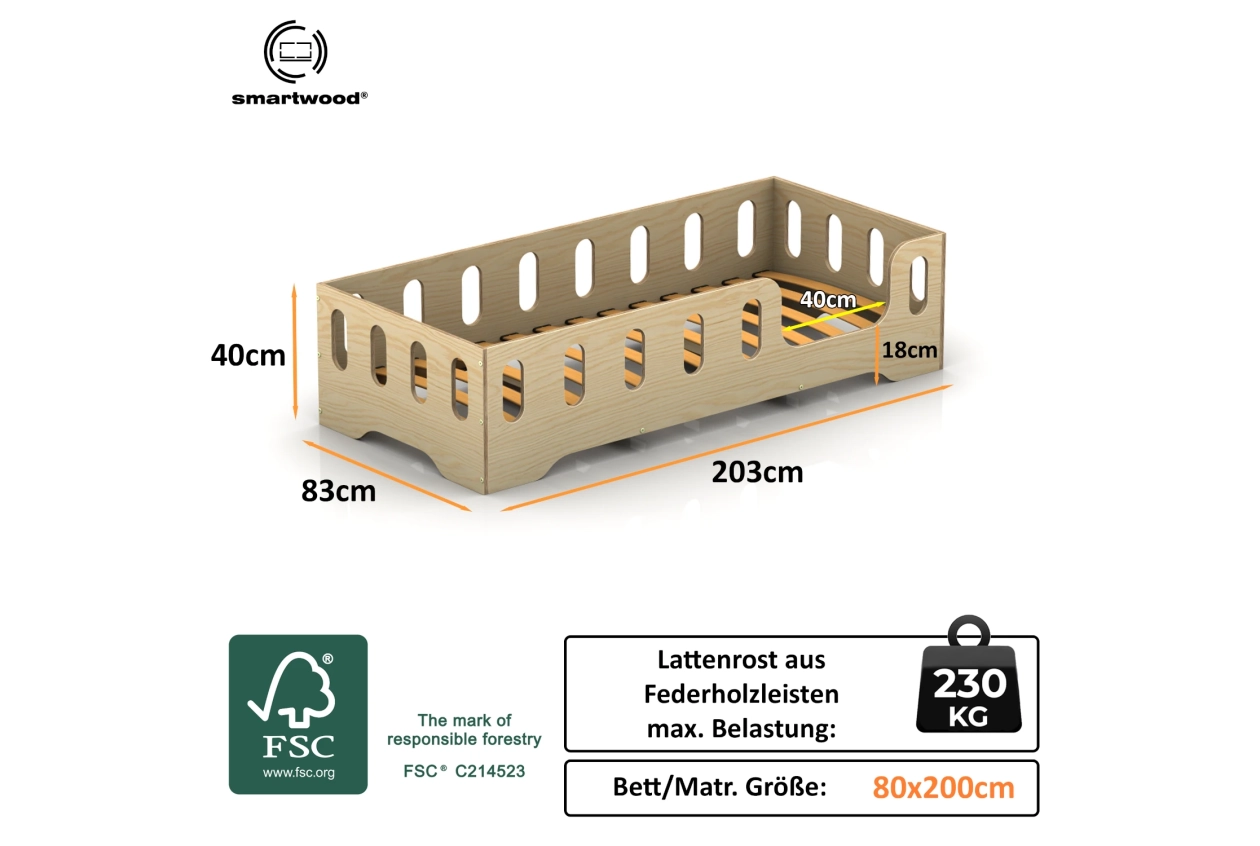 Einzelbett für Kinder mit Rausfallschutz und Lattenrost TILA 2 Montessori Holz