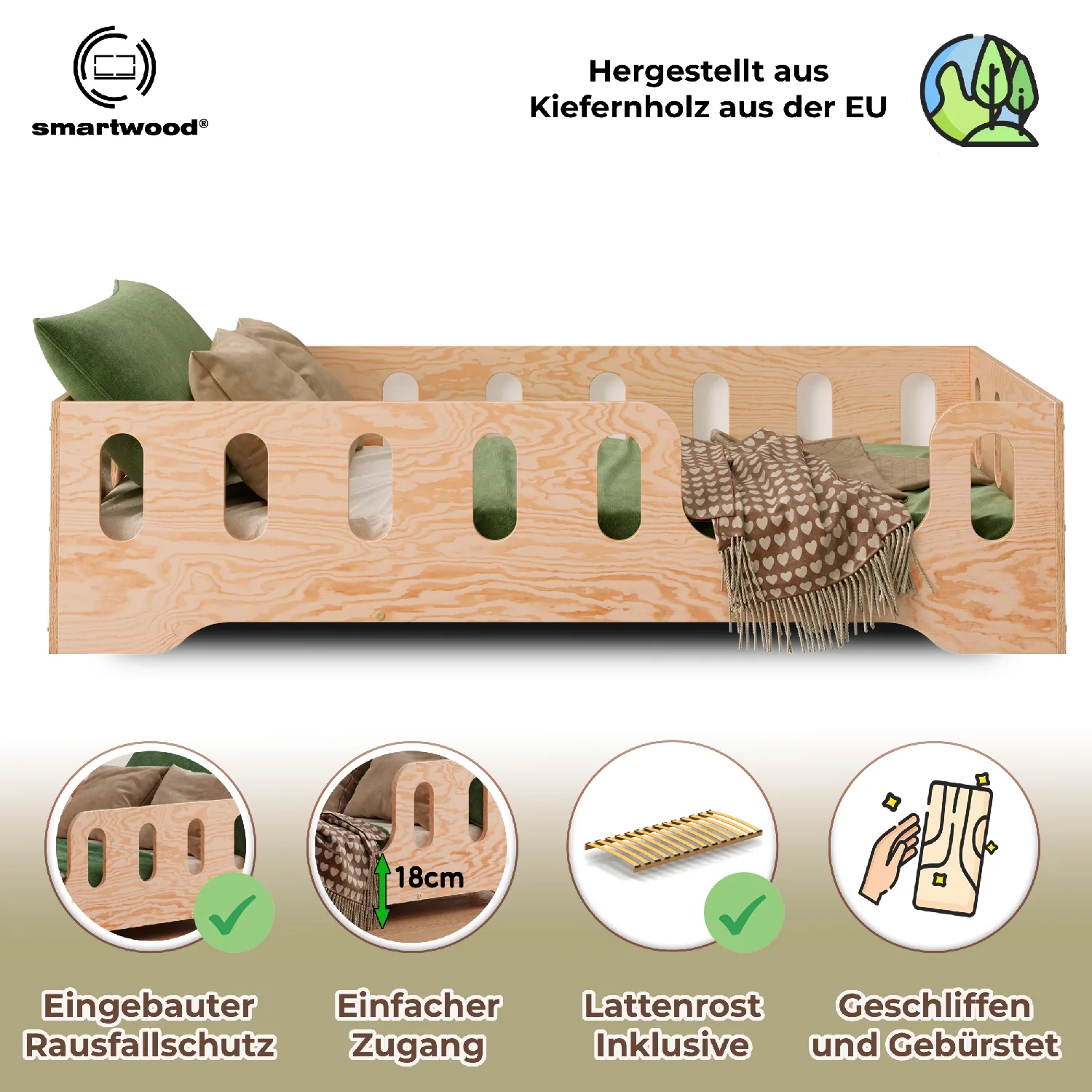 Einzelbett für Kinder mit Rausfallschutz und Lattenrost TILA 2 Montessori Holz