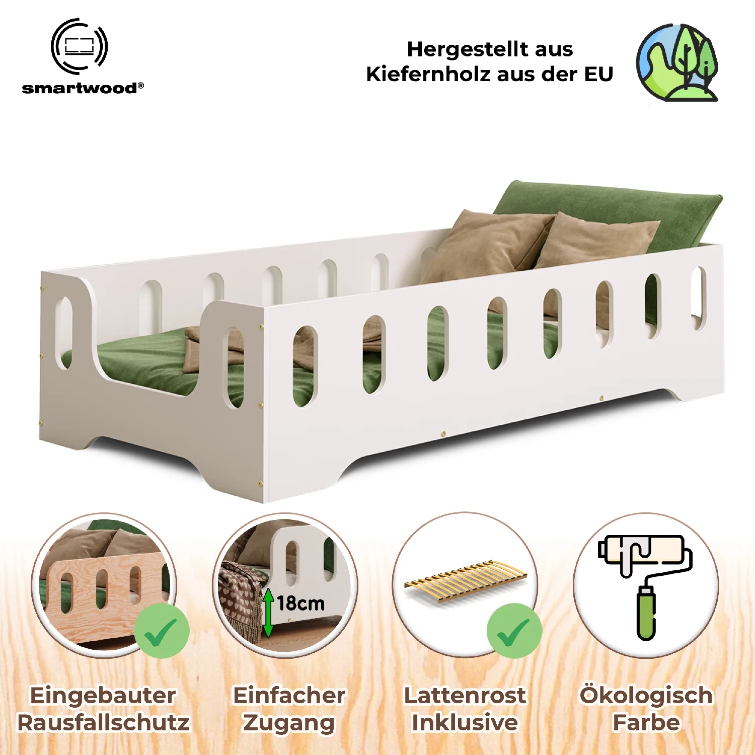 Einzelbett für Kinder mit Rausfallschutz und Lattenrost TILA 2 Montessori Holz