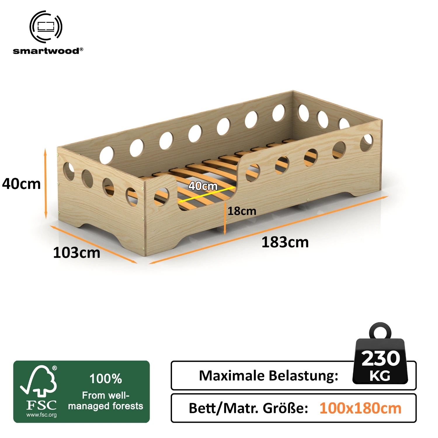 Einzelbett für Kinder mit Rausfallschutz und Lattenrost TILA 4 Montessori Holz