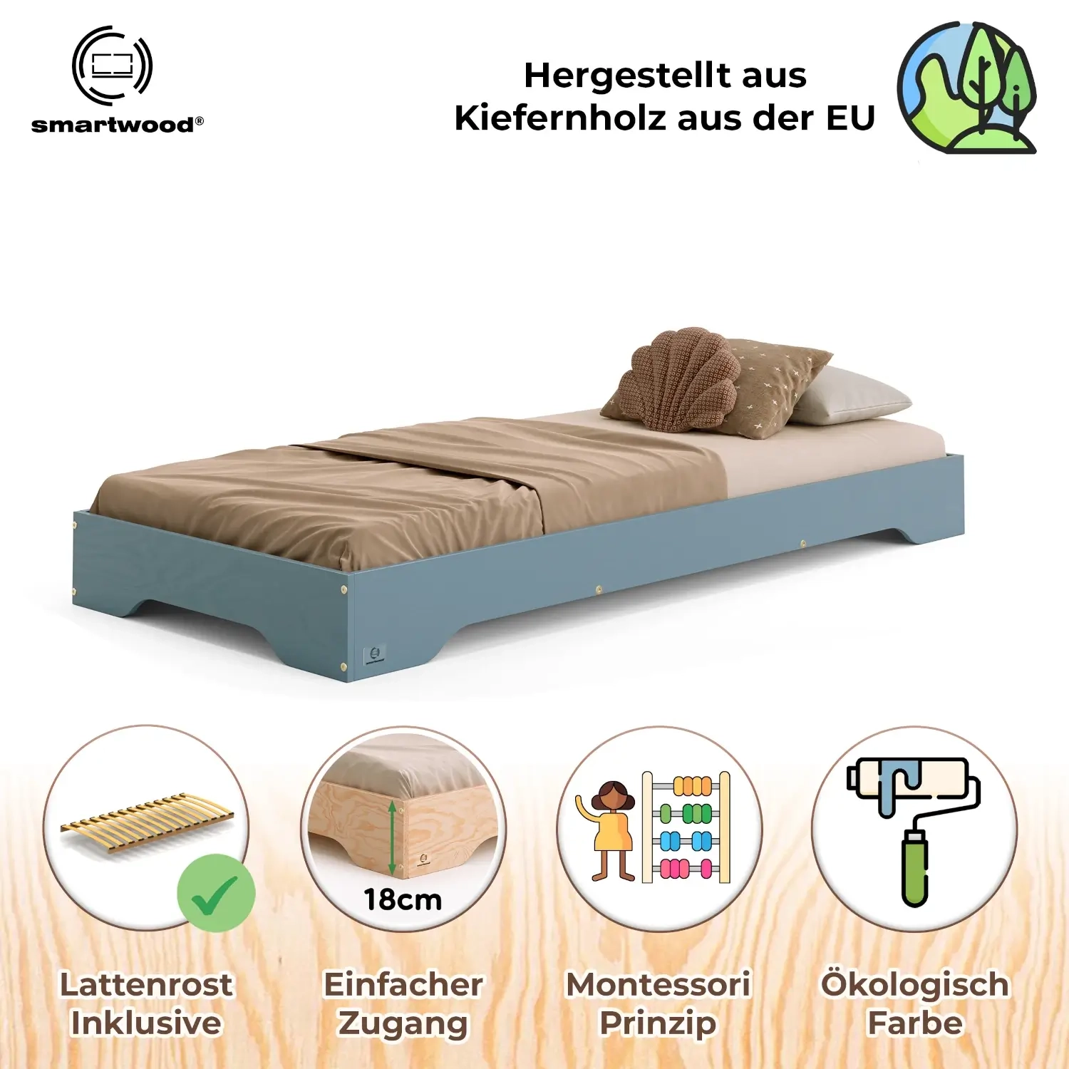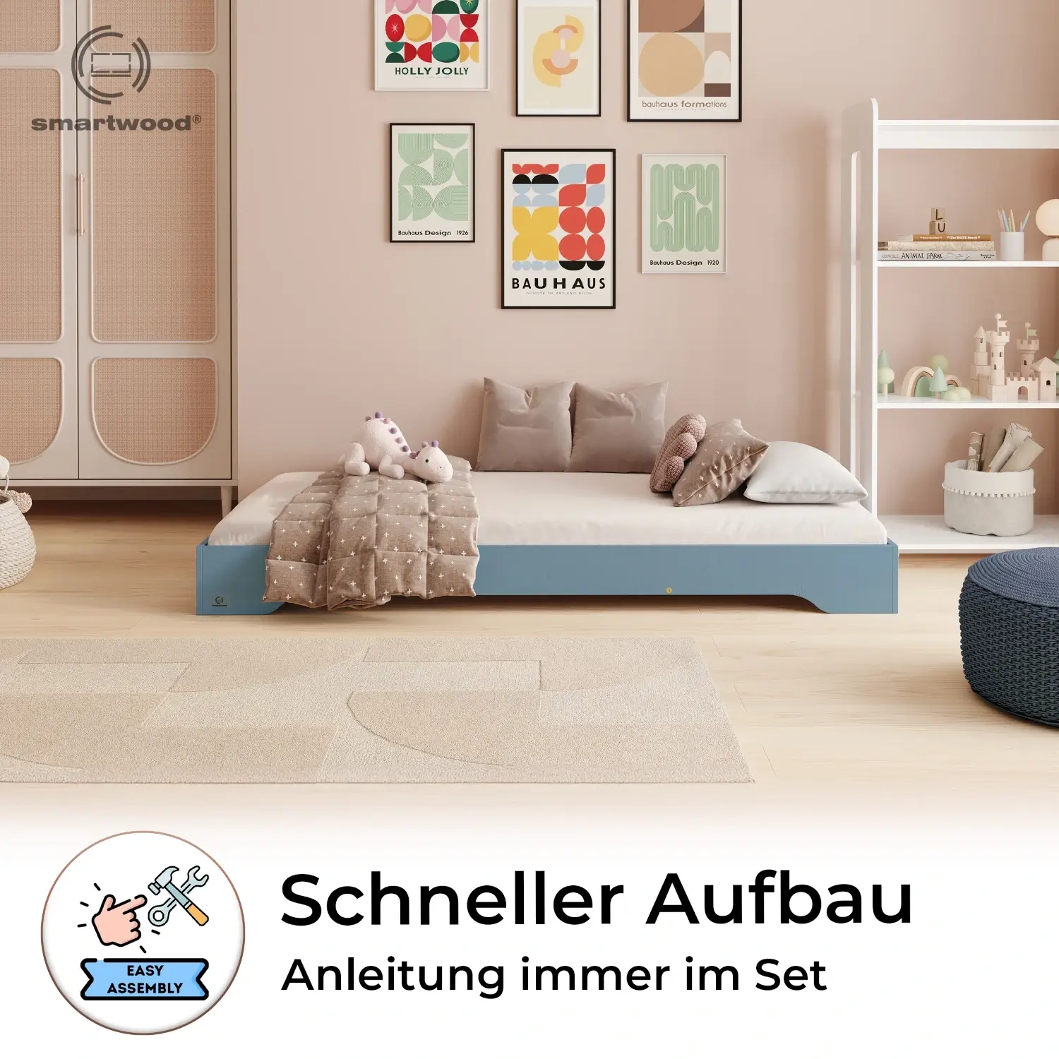 Das Bodenbett TILA 7 wurde nach der Montessori-Philosophie entworfen und fördert die Unabhängigkeit und Entwicklung Deines Kindes. Das niedrige Bett ermöglicht es dem Kind, einfach ein- und auszusteigen, was die Selbstständigkeit schon von den ersten Lebensjahren an unterstützt. Hergestellt aus hochwertigem Kiefernsperrholz, ist es in 11 Farben und 23 Größen erhältlich und passt sich jedem Raumstil an, während es sowohl funktional als auch ästhetisch ist. Die glatten, abgerundeten Kanten minimieren das Verletzungsrisiko und sorgen für Sicherheit und Komfort, bestätigt durch das renommierte deutsche Prüfengel-Zertifikat. Der inklusive Lattenrost mit der max. Belastbarkeit bis zu 300 kg macht das Bett sofort nach dem Zusammenbau einsatzbereit.