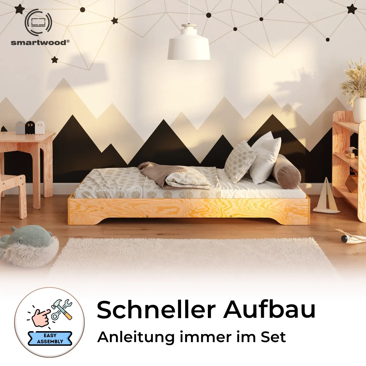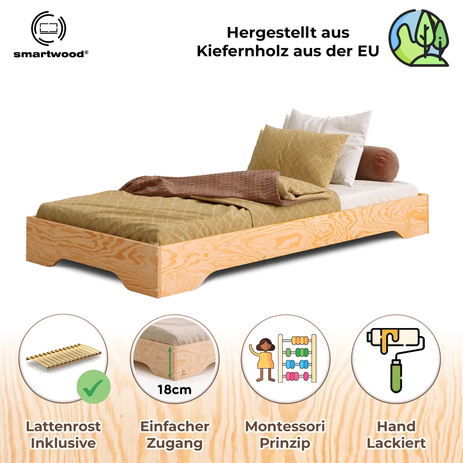 Das Bodenbett TILA 7 wurde nach der Montessori-Philosophie entworfen und fördert die Unabhängigkeit und Entwicklung Deines Kindes. Das niedrige Bett ermöglicht es dem Kind, einfach ein- und auszusteigen, was die Selbstständigkeit schon von den ersten Lebensjahren an unterstützt. Hergestellt aus hochwertigem Kiefernsperrholz, ist es in 11 Farben und 23 Größen erhältlich und passt sich jedem Raumstil an, während es sowohl funktional als auch ästhetisch ist. Die glatten, abgerundeten Kanten minimieren das Verletzungsrisiko und sorgen für Sicherheit und Komfort, bestätigt durch das renommierte deutsche Prüfengel-Zertifikat. Der inklusive Lattenrost mit der max. Belastbarkeit bis zu 300 kg macht das Bett sofort nach dem Zusammenbau einsatzbereit.