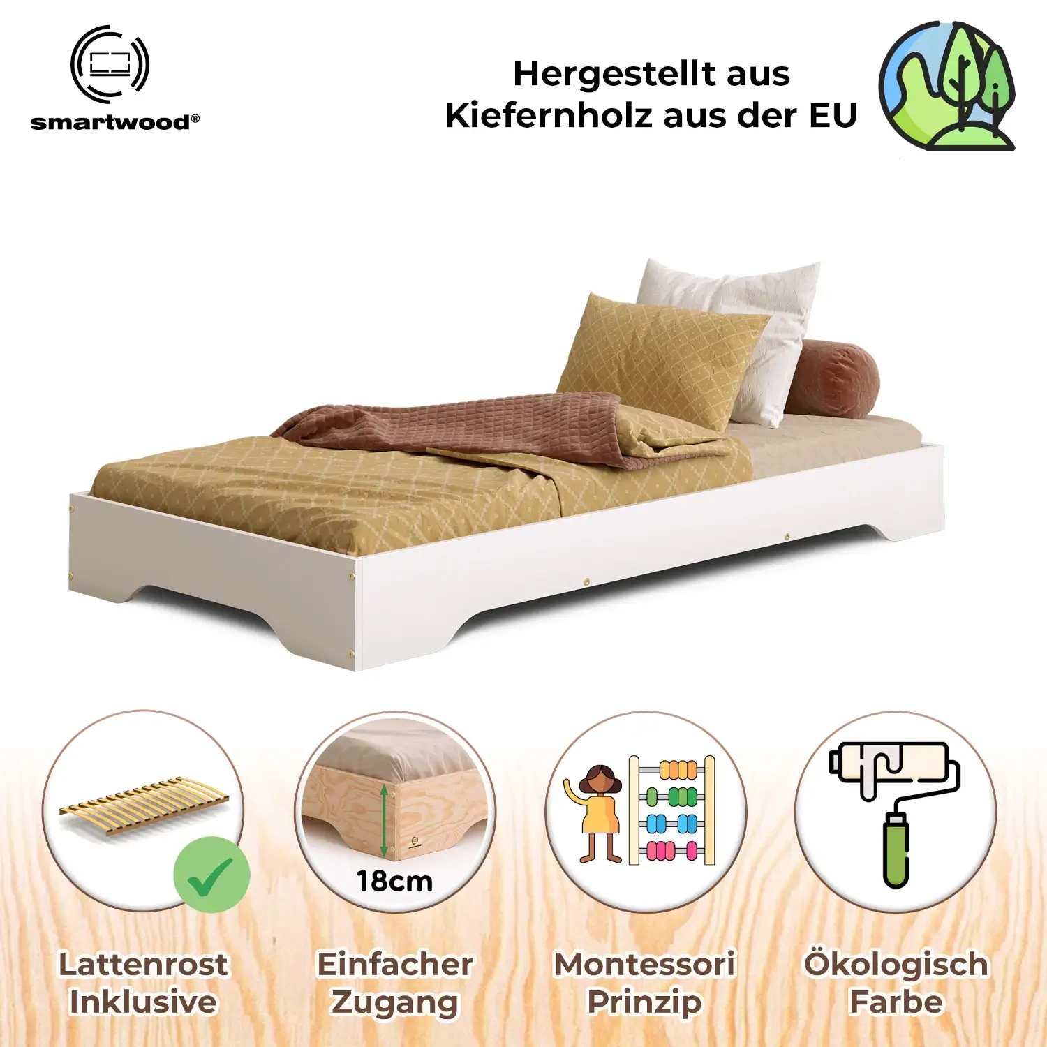 Das Bodenbett TILA 7 wurde nach der Montessori-Philosophie entworfen und fördert die Unabhängigkeit und Entwicklung Deines Kindes. Das niedrige Bett ermöglicht es dem Kind, einfach ein- und auszusteigen, was die Selbstständigkeit schon von den ersten Lebensjahren an unterstützt. Hergestellt aus hochwertigem Kiefernsperrholz, ist es in 11 Farben und 23 Größen erhältlich und passt sich jedem Raumstil an, während es sowohl funktional als auch ästhetisch ist. Die glatten, abgerundeten Kanten minimieren das Verletzungsrisiko und sorgen für Sicherheit und Komfort, bestätigt durch das renommierte deutsche Prüfengel-Zertifikat. Der inklusive Lattenrost mit der max. Belastbarkeit bis zu 300 kg macht das Bett sofort nach dem Zusammenbau einsatzbereit.
