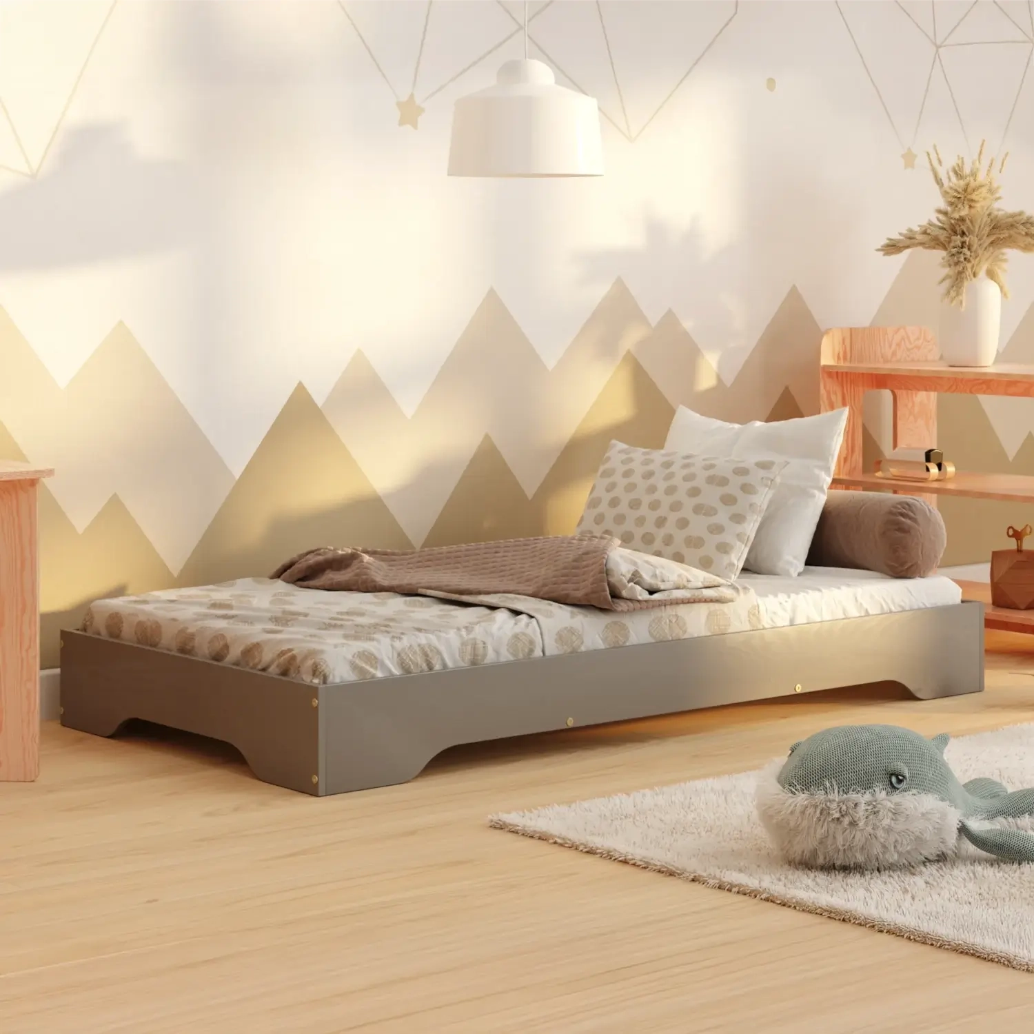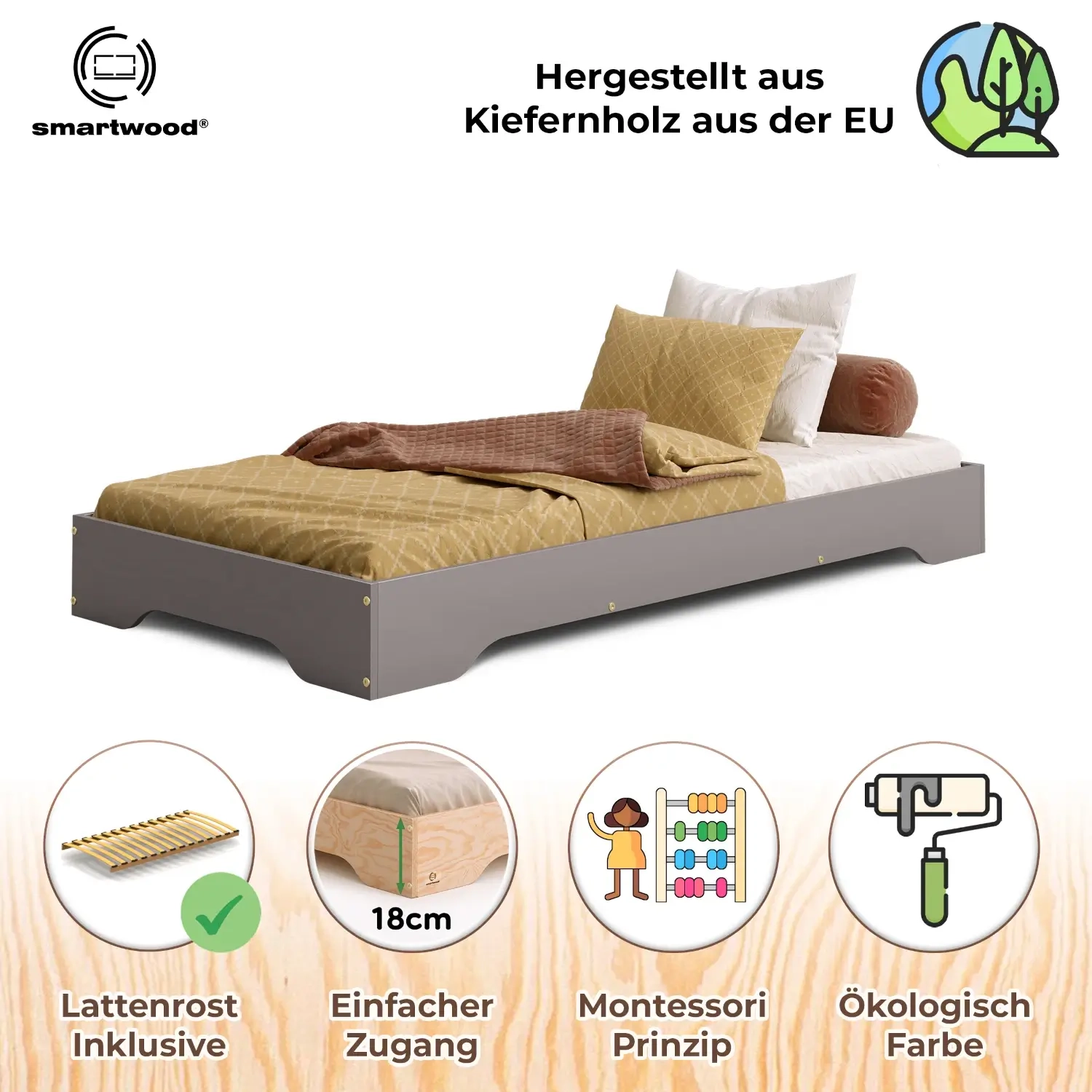 Das Bodenbett TILA 7 wurde nach der Montessori-Philosophie entworfen und fördert die Unabhängigkeit und Entwicklung Deines Kindes. Das niedrige Bett ermöglicht es dem Kind, einfach ein- und auszusteigen, was die Selbstständigkeit schon von den ersten Lebensjahren an unterstützt. Hergestellt aus hochwertigem Kiefernsperrholz, ist es in 11 Farben und 23 Größen erhältlich und passt sich jedem Raumstil an, während es sowohl funktional als auch ästhetisch ist. Die glatten, abgerundeten Kanten minimieren das Verletzungsrisiko und sorgen für Sicherheit und Komfort, bestätigt durch das renommierte deutsche Prüfengel-Zertifikat. Der inklusive Lattenrost mit der max. Belastbarkeit bis zu 300 kg macht das Bett sofort nach dem Zusammenbau einsatzbereit.