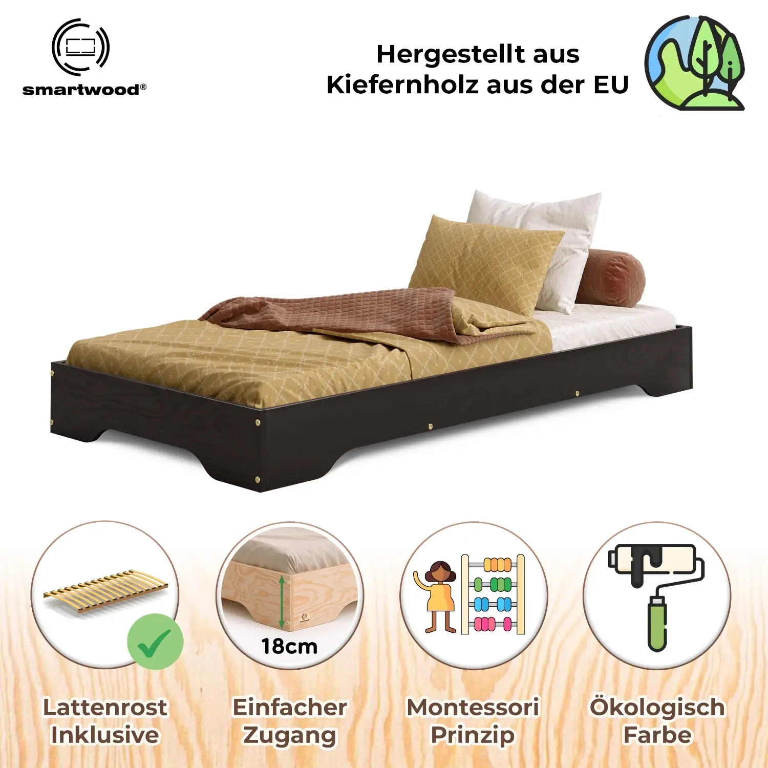 Das Bodenbett TILA 7 wurde nach der Montessori-Philosophie entworfen und fördert die Unabhängigkeit und Entwicklung Deines Kindes. Das niedrige Bett ermöglicht es dem Kind, einfach ein- und auszusteigen, was die Selbstständigkeit schon von den ersten Lebensjahren an unterstützt. Hergestellt aus hochwertigem Kiefernsperrholz, ist es in 11 Farben und 23 Größen erhältlich und passt sich jedem Raumstil an, während es sowohl funktional als auch ästhetisch ist. Die glatten, abgerundeten Kanten minimieren das Verletzungsrisiko und sorgen für Sicherheit und Komfort, bestätigt durch das renommierte deutsche Prüfengel-Zertifikat. Der inklusive Lattenrost mit der max. Belastbarkeit bis zu 300 kg macht das Bett sofort nach dem Zusammenbau einsatzbereit.
