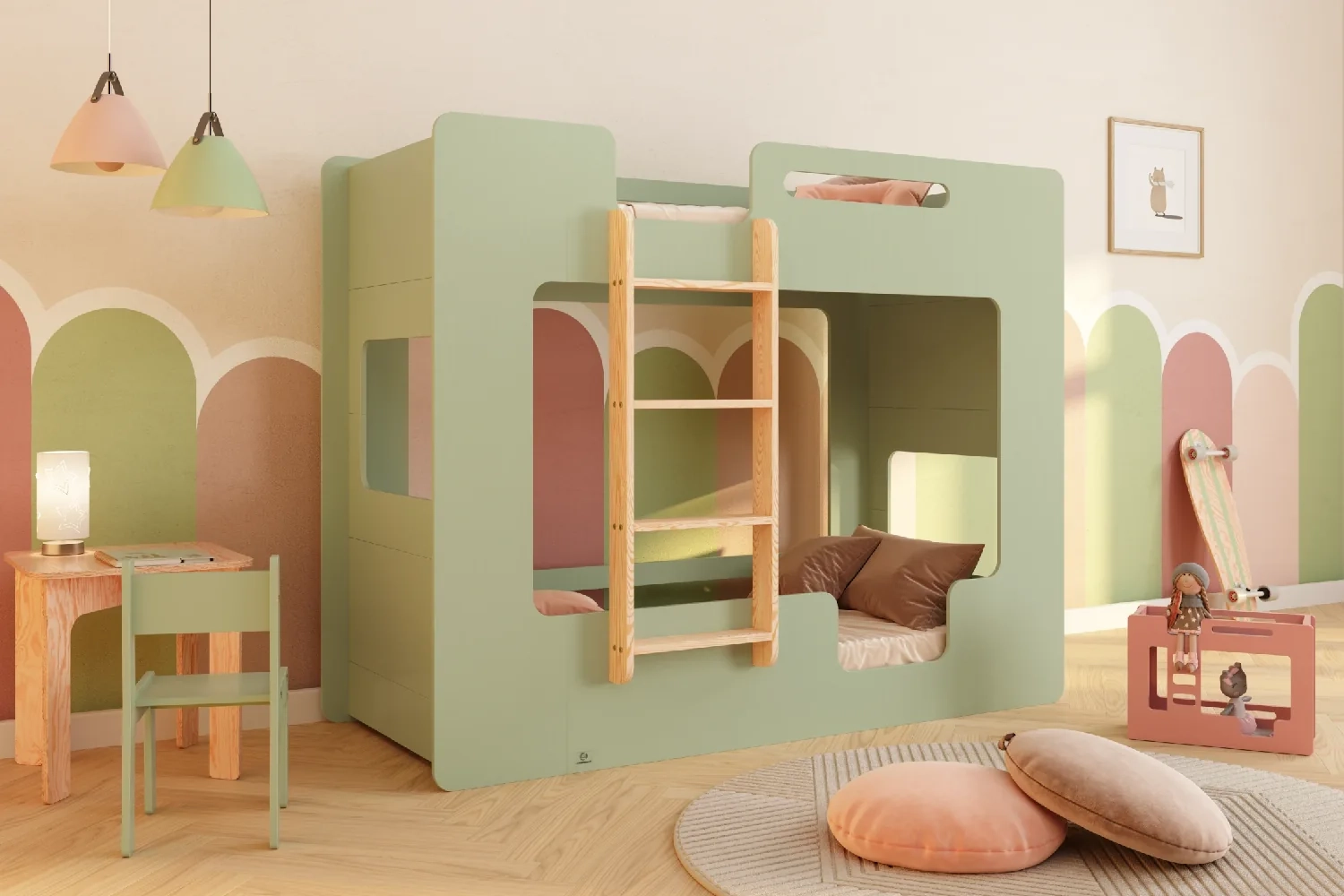 Ein Etagenbett mit mehr als zwei Eingängen unterstützt die vielseitige Entwicklung des Kindes, indem es die Vorstellungskraft und Kreativität stimuliert. Die verschiedenen Eingänge ermöglichen die Gestaltung komplexer Spielszenarien wie Burgen oder Basen, was das flexible Denken fördert. Verschiedene Arten von Eingängen beanspruchen unterschiedliche Muskelgruppen, fördern die körperliche Aktivität und die motorische Entwicklung sowie verbessern die Koordination und Planungsfähigkeiten.