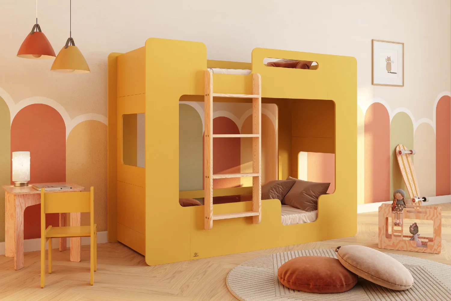 Ein Etagenbett mit mehr als zwei Eingängen unterstützt die vielseitige Entwicklung des Kindes, indem es die Vorstellungskraft und Kreativität stimuliert. Die verschiedenen Eingänge ermöglichen die Gestaltung komplexer Spielszenarien wie Burgen oder Basen, was das flexible Denken fördert. Verschiedene Arten von Eingängen beanspruchen unterschiedliche Muskelgruppen, fördern die körperliche Aktivität und die motorische Entwicklung sowie verbessern die Koordination und Planungsfähigkeiten.