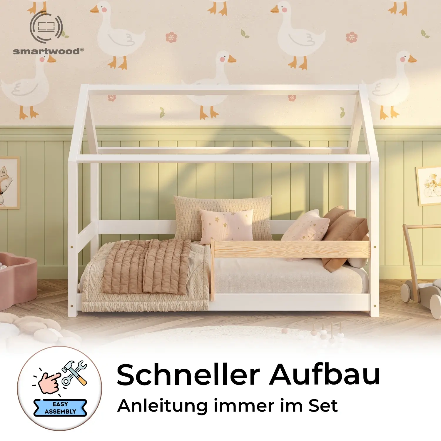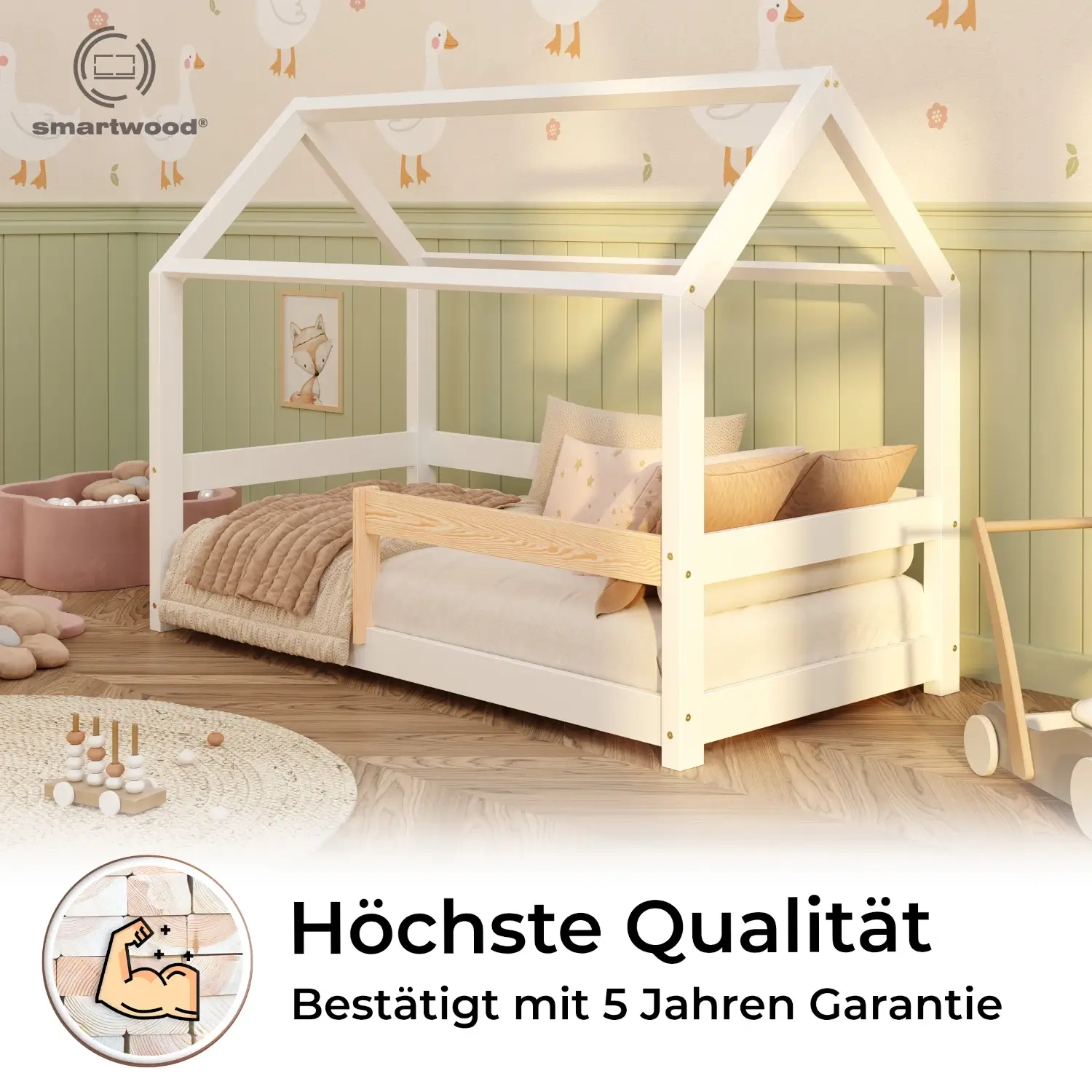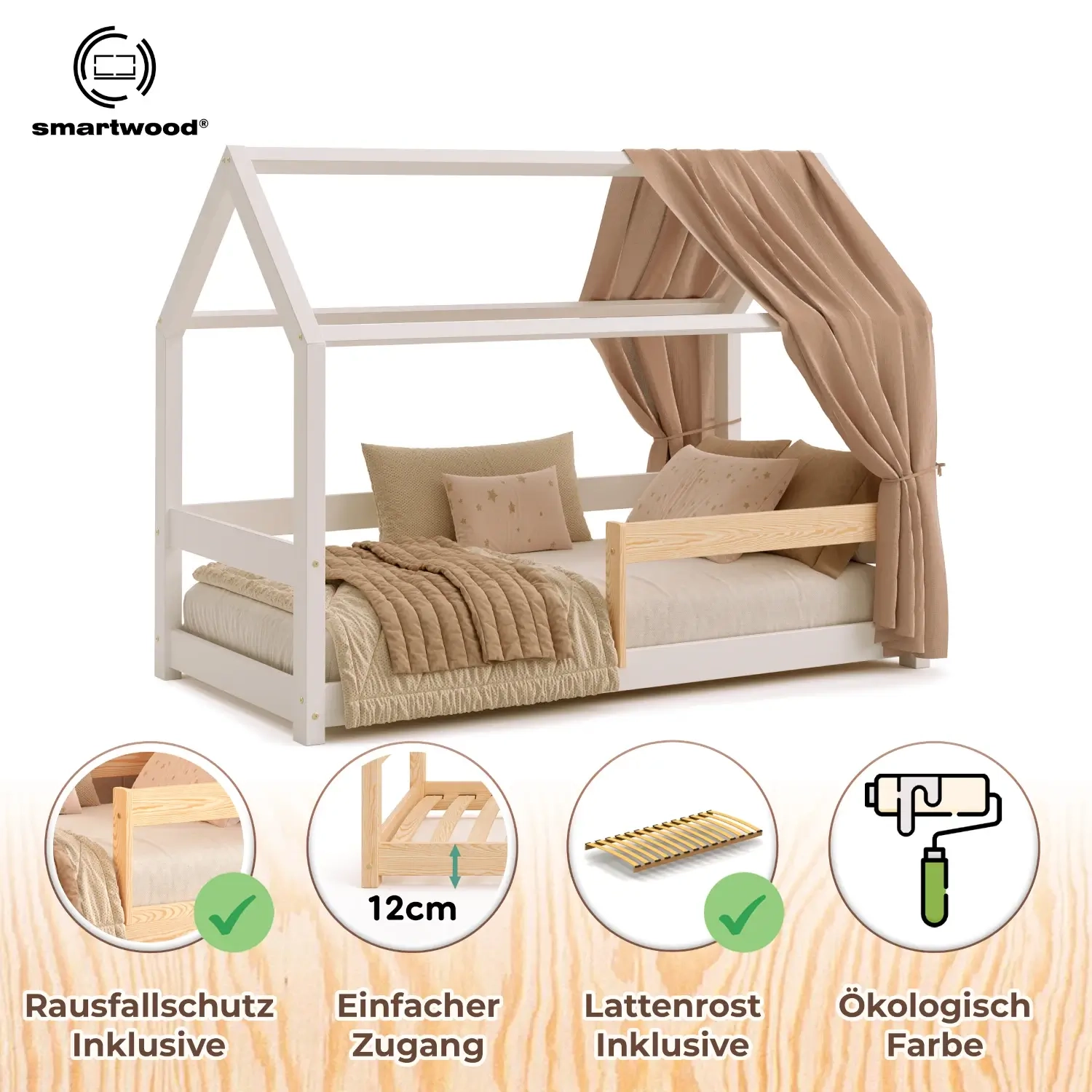 Hausbett für Kinder mit Rausfallschutz und Lattenrost MILO Montessori Holz