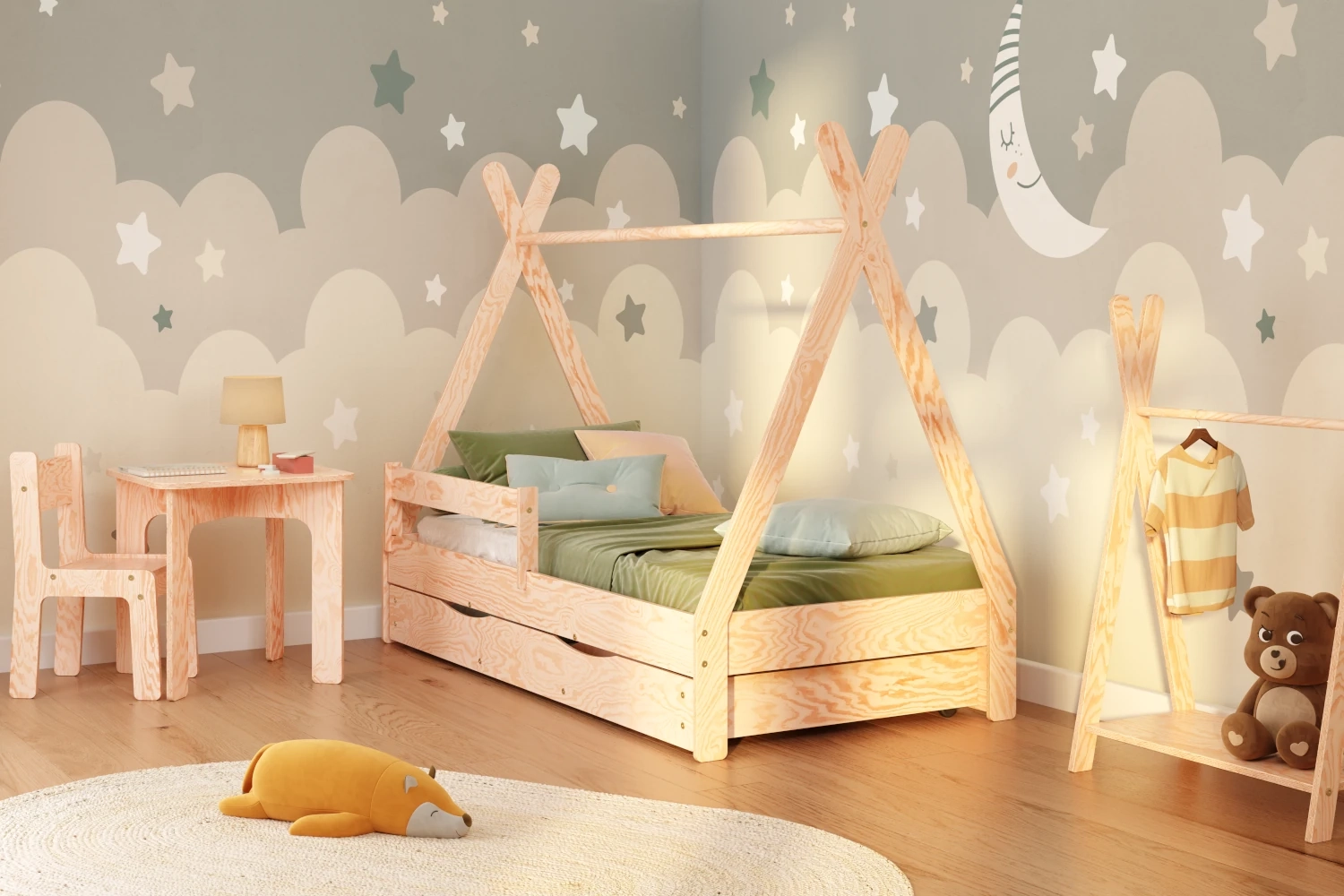 Unser Kinderbett TIPI DRAWER erfüllt Ihre Erwartungen. Es ist nicht nur äußerst komfortabel und sicher, sondern auch sehr stilvoll. Die die Beine verbindende Stange ermöglicht eine freie Dekoration des Bettes mit einem Baldachin, Lichtern und vielen anderen Dingen, die sich Ihr Kind wünscht.