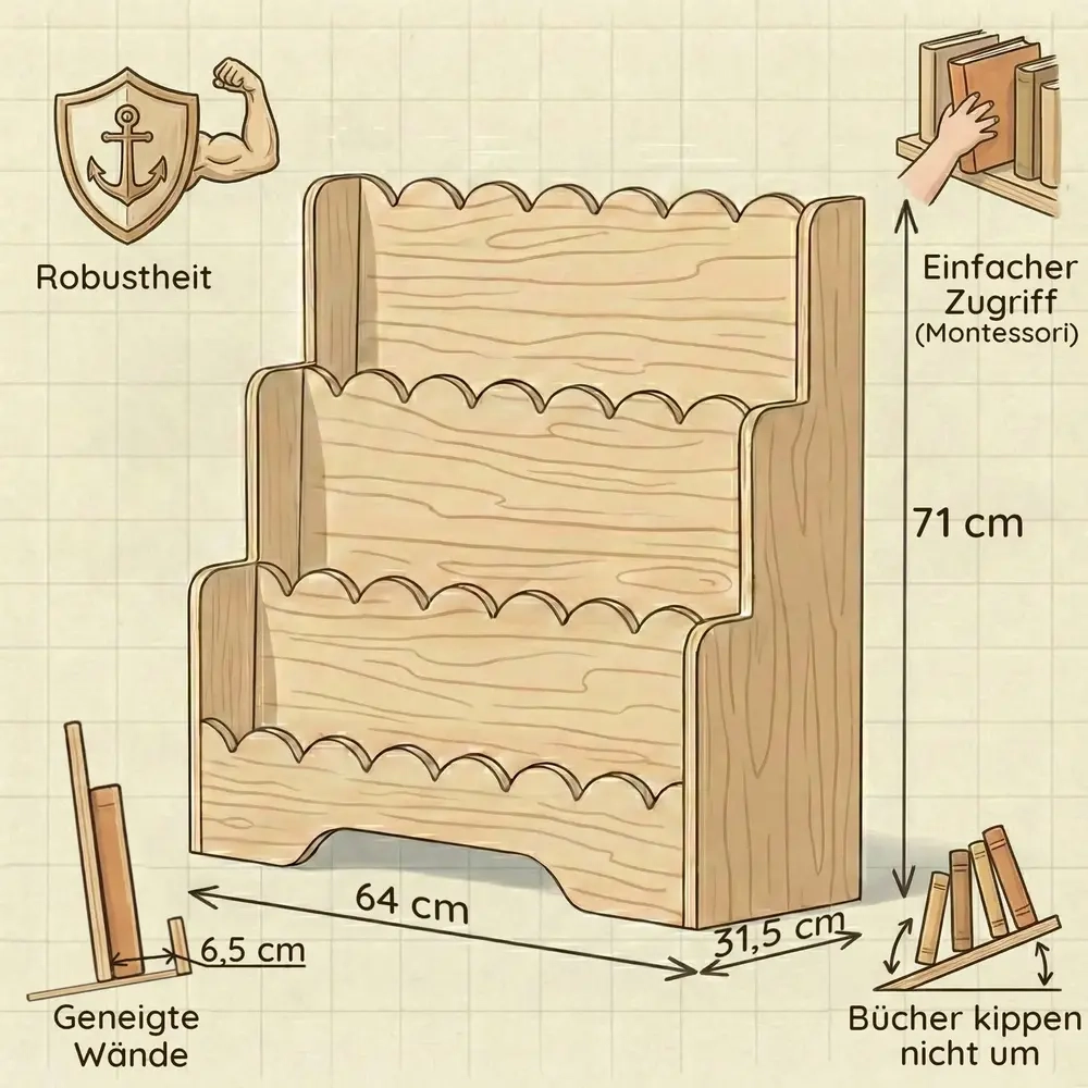 Das Regal garantiert nicht nur Solidität und Langlebigkeit, sondern schafft auch sichere Entwicklungsbedingungen im Kinderzimmer für viele Jahre. Verleihe dem Kinderzimmer deines Kindes Charme und Sicherheit!