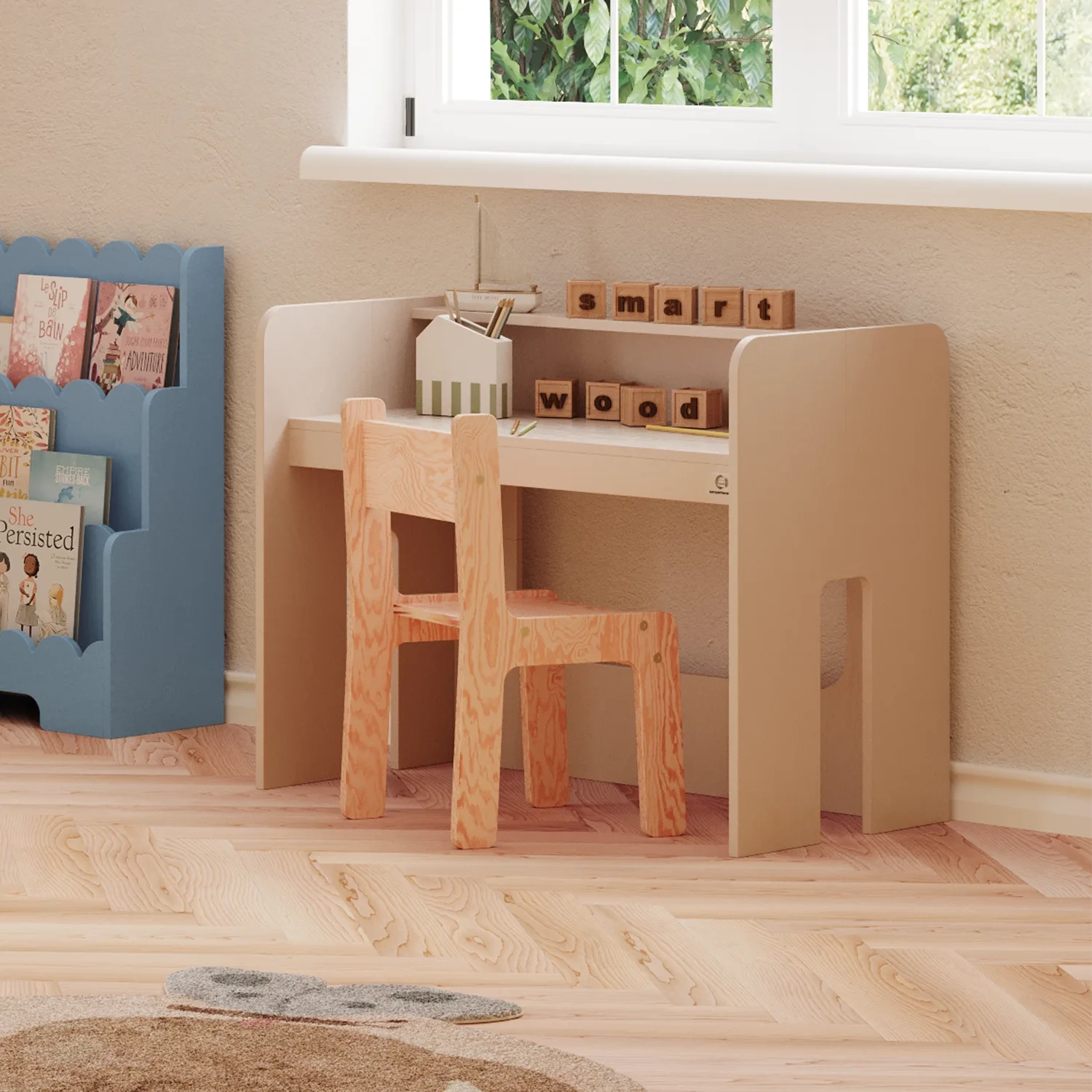 Die durchdachte Konstruktion des Sets strahlt nicht nur Solidität aus, sondern präsentiert auch glatte und sanft abgerundete Kanten, die sowohl ästhetisch ansprechend sind als auch vollständige Sicherheit und Komfort bei der Nutzung bieten. Der Schreibtisch mit dem Stuhl garantiert nicht nur Stabilität und Langlebigkeit, sondern schafft auch sichere Bedingungen für die jahrelange Entwicklung im Kinderzimmer. Verleihe dem Raum deines Kindes Charme und Vertrauen.
