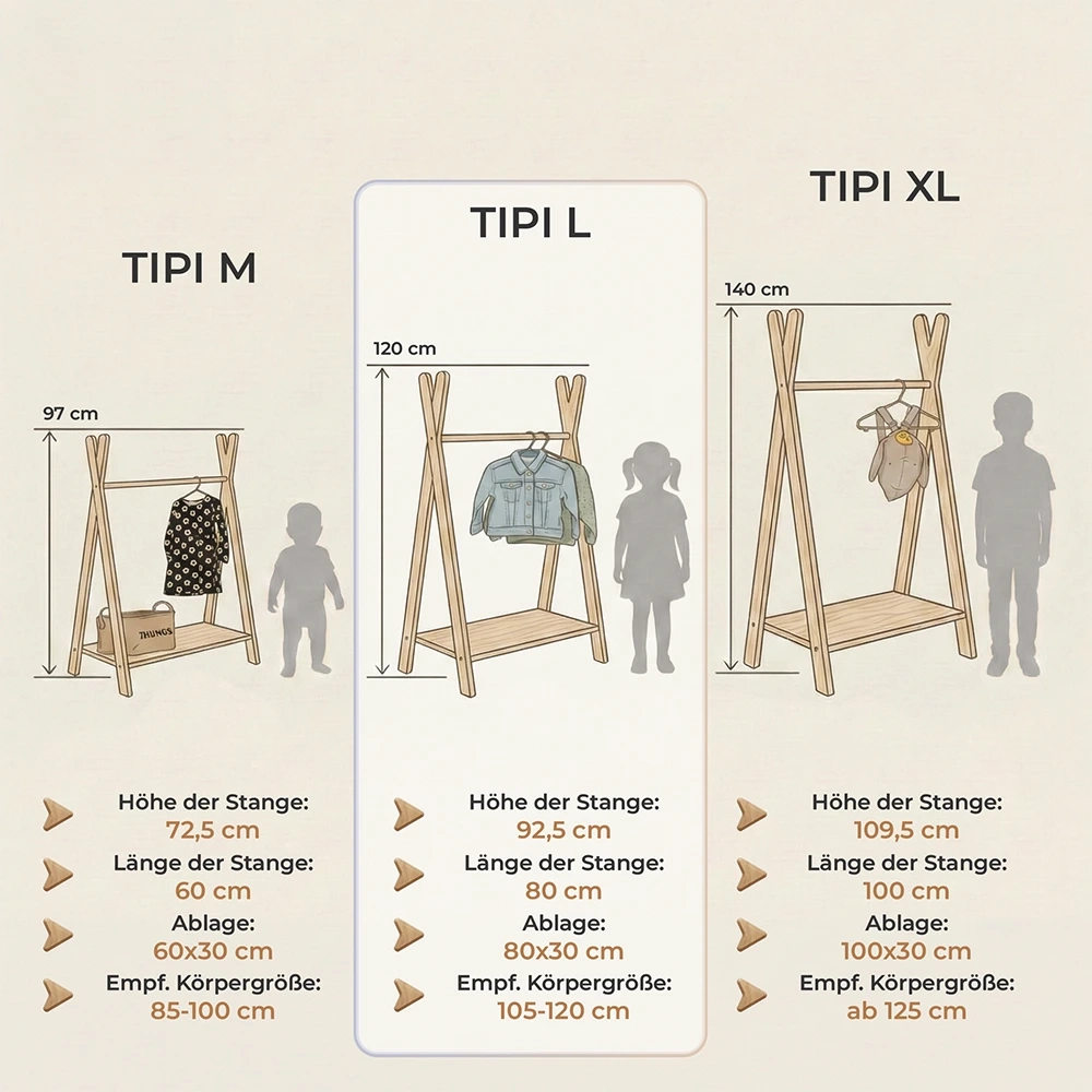 Kleine Menschen brauchen einen passenden Kleiderständer für ihre kleinen Kleidungsstücke - das ist offensichtlich. Mit diesem Gedanken haben wir eine Reihe von Kleiderständern entworfen, die vor allem für die jüngsten Familienmitglieder zugänglich und handlich sind ;) Schuhe oder andere Accessoires können Sie unter die Basis legen oder darauf stellen, und die horizontale Stange hält eine ganze Reihe von Kleiderbügeln. Selbst die Spitzen der Beine eignen sich zum Aufhängen von Hüten oder Lieblingsketten. Außerdem - großartiger Stil und Ästhetik - das sind nur einige der Vorteile des TIPI-Kleiderständers, der in drei Größen erhältlich ist.