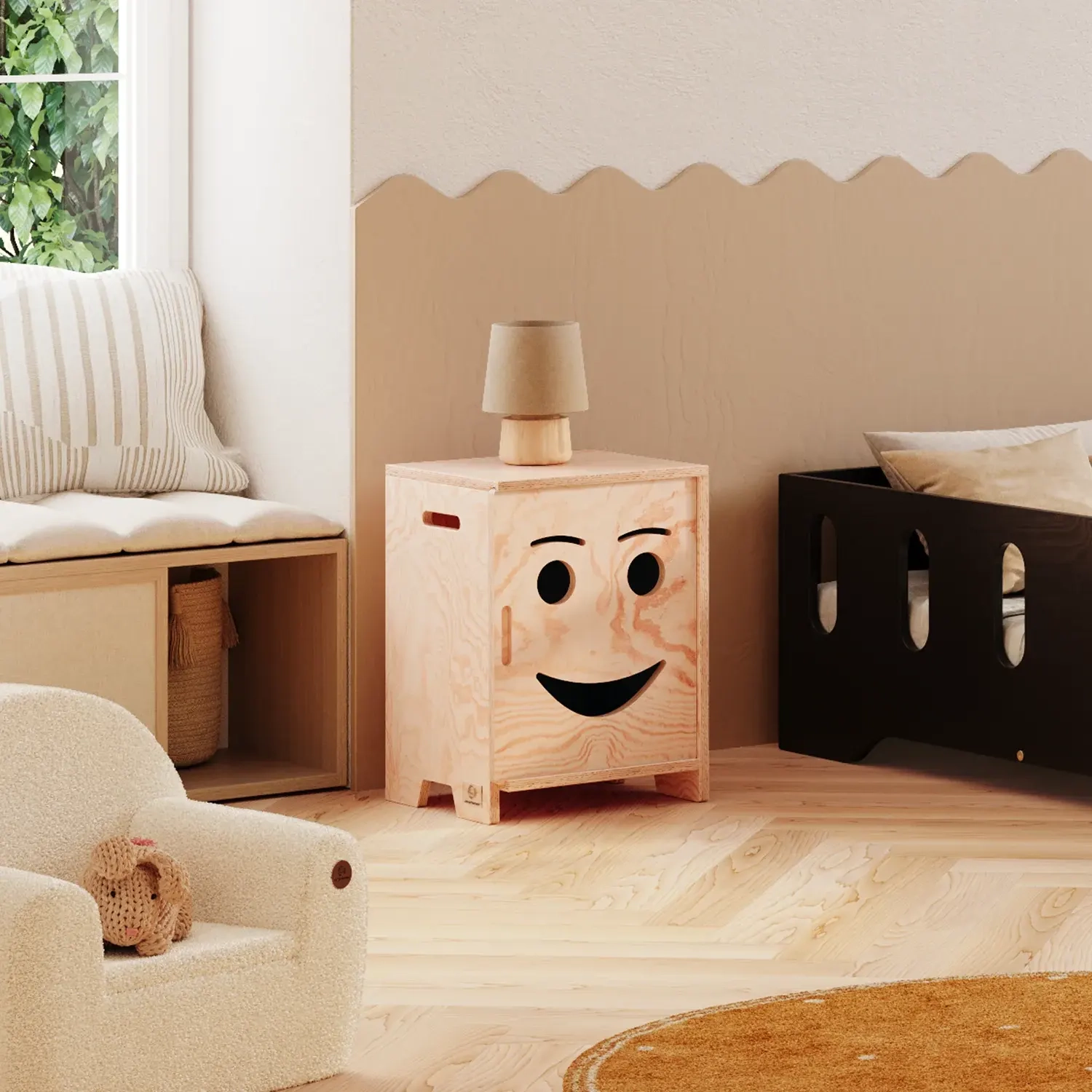 Nachttisch KAPI ist die perfekte Kombination aus Funktionalität und Charme, speziell für die Kleinen entwickelt. Hergestellt aus hochwertigem Kiefernsperrholz, zeichnet er sich durch eine stabile Konstruktion und glatte, abgerundete Kanten aus, die für Sicherheit bei der Nutzung sorgen. Ein einzigartiges Element sind die Schiebetüren mit ausgeschnittenen, lächelnden Gesichtern, die dem Möbelstück Charakter verleihen und die Kinder dazu ermutigen, es selbstständig zu nutzen. Der Nachttisch ist in 3 verschiedenen Varianten und 11 Farben erhältlich, sodass er perfekt in jedes Kinderzimmer passt. Die kompakten Maße machen ihn ideal für die Aufbewahrung von Lieblingsspielzeugen oder Büchern Ihres Kindes und helfen gleichzeitig dabei, Organisation und Ordnung zu lernen.